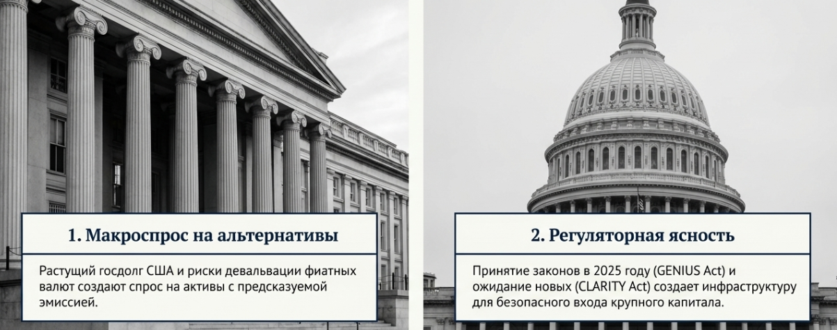 Первая тема в списке Grayscale не случайно занимает верхнюю строчку. Макроэкономический контекст 2026 года создаёт беспрецедентный спрос на активы с предсказуемой и ограниченной эмиссией. Государственный долг США превысил отметку $36 триллионов, дефицит федерального бюджета продолжает расти, а Федеральная резервная система трижды снизила процентную ставку в 2025 году — и рынок ожидает продолжения смягчения в 2026-м.