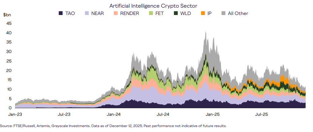 Пересечение искусственного интеллекта и блокчейна — самая спекулятивная тема в списке Grayscale, но и потенциально самая трансформационная. Проблема, которую пытаются решить проекты в этой нише: централизация AI в руках нескольких корпораций — Google, OpenAI, Microsoft, Anthropic. Данные, вычисления, модели — всё контролируется узким кругом игроков.