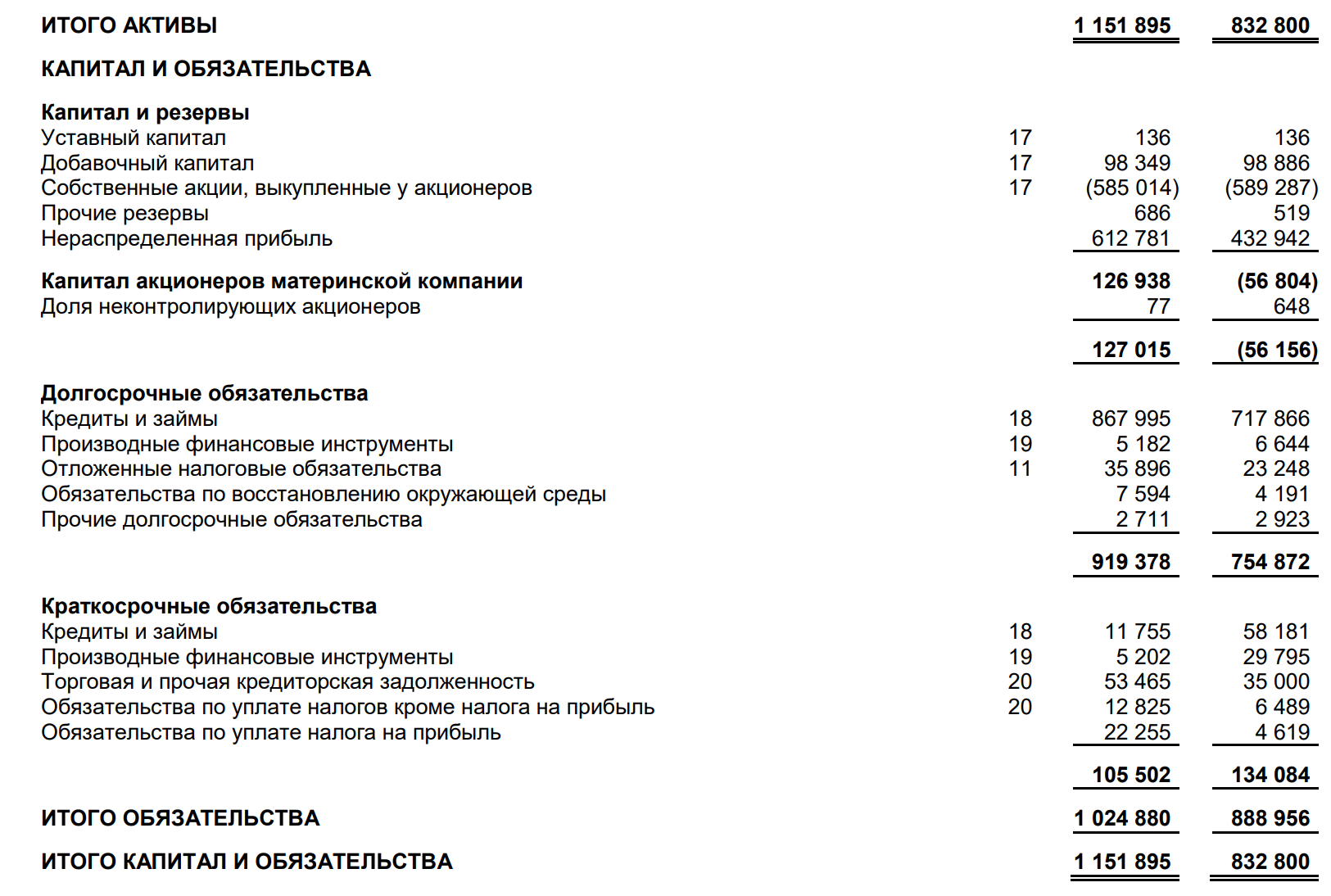 Выполняется балансовое равенство, согласно которому Активы (1 151 895 млн рублей) можно рассчитать, как Капитал + Обязательства.