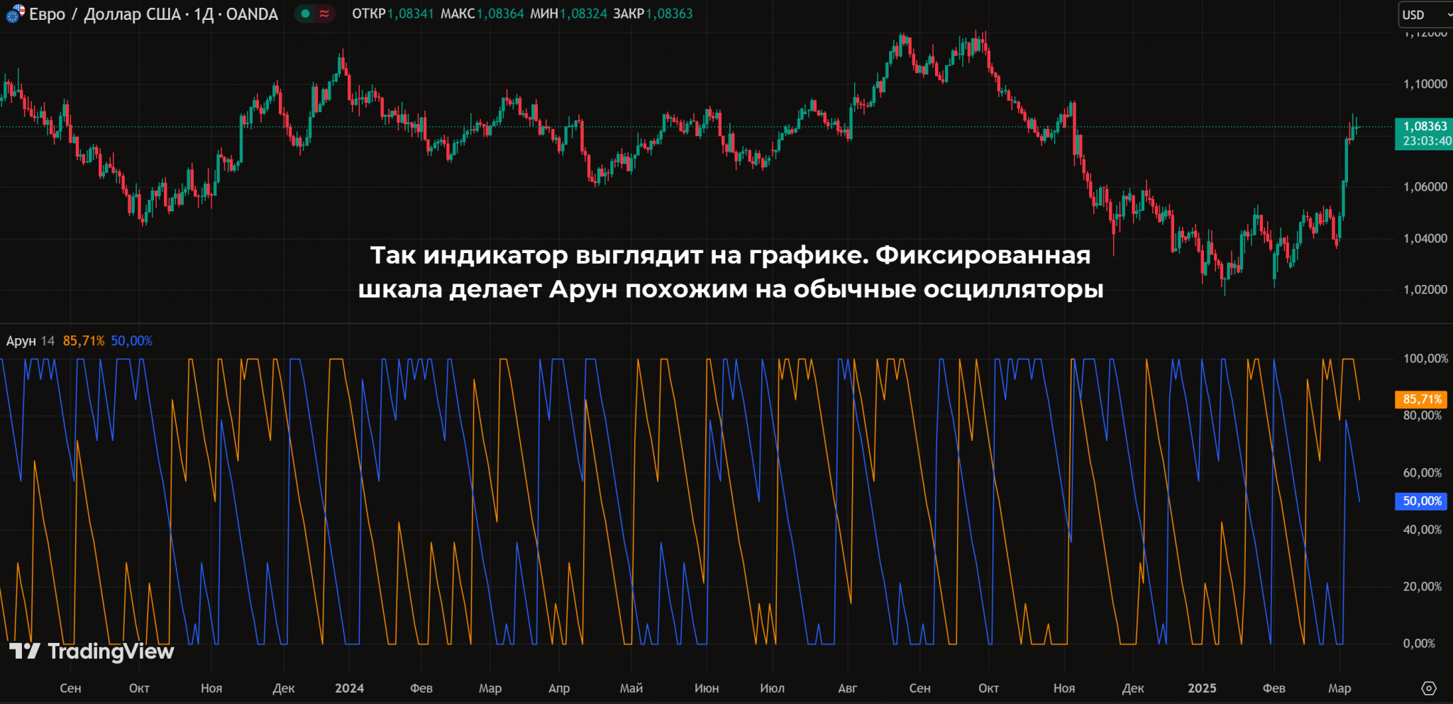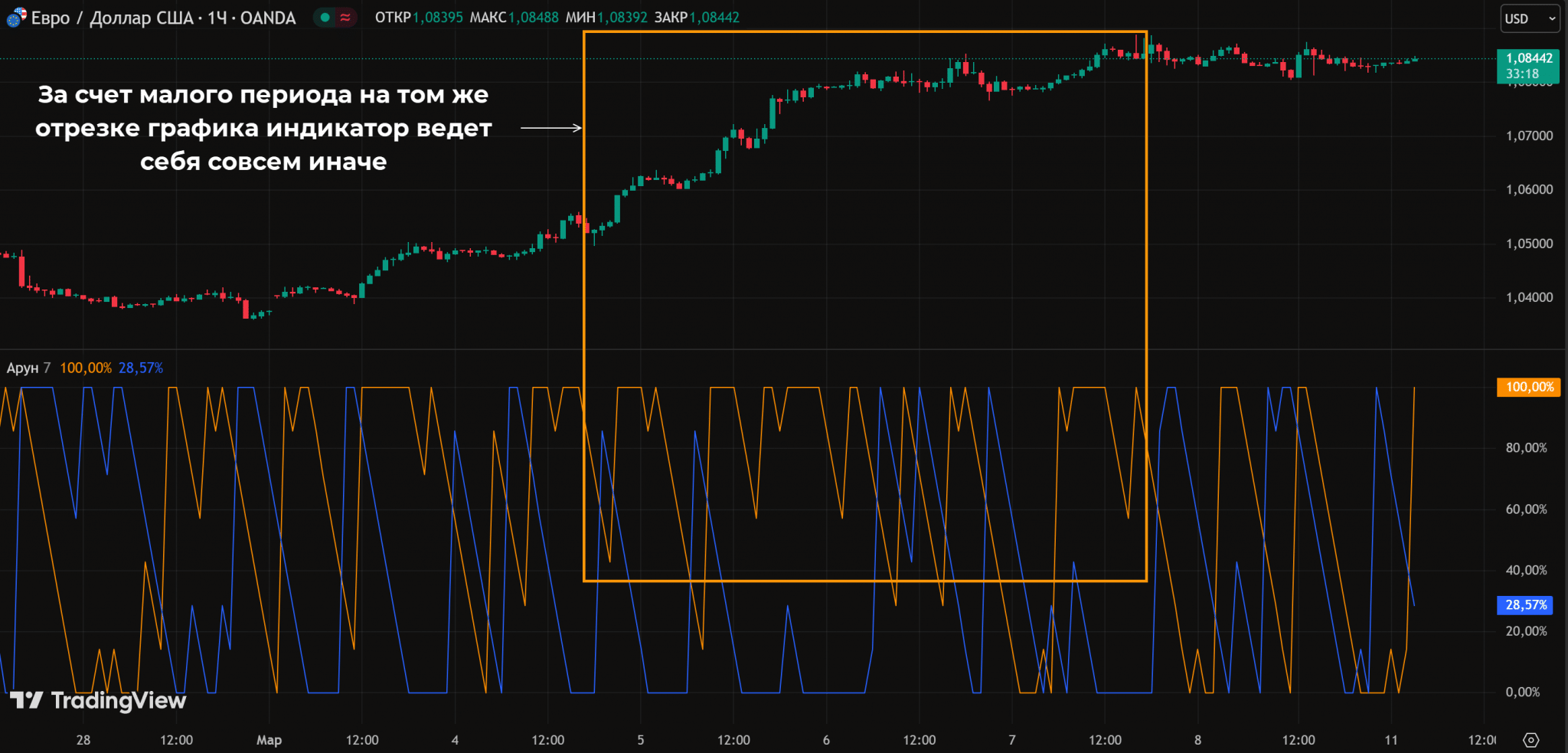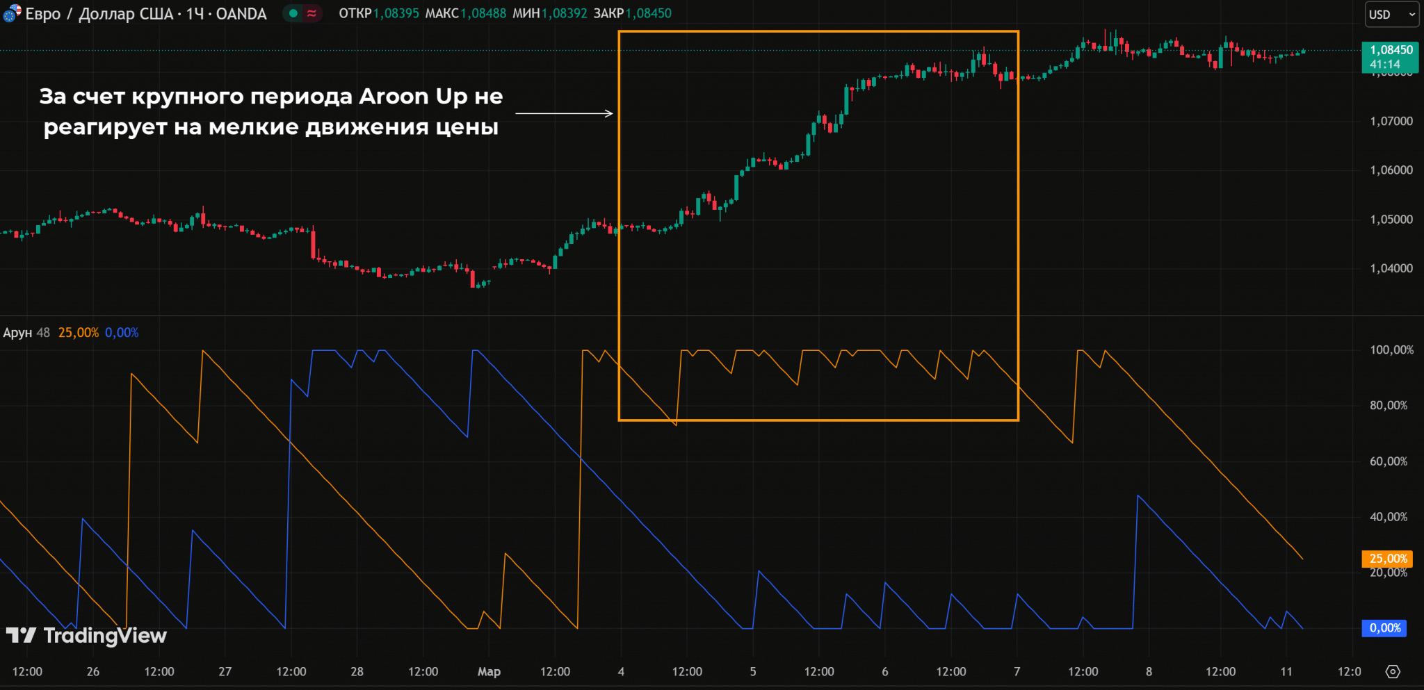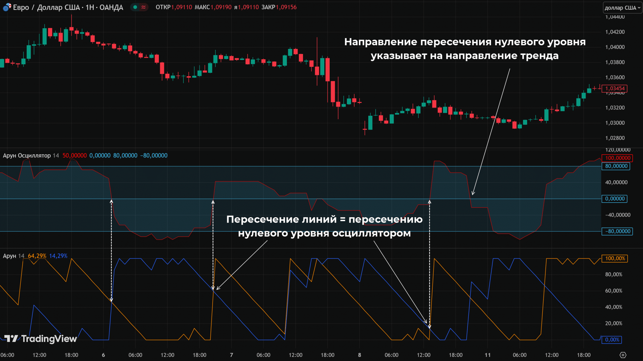 Показания Арун рассчитываются с учетом максимума и минимума, на дистанции в N свечей. Период задается в настройках индикатора.