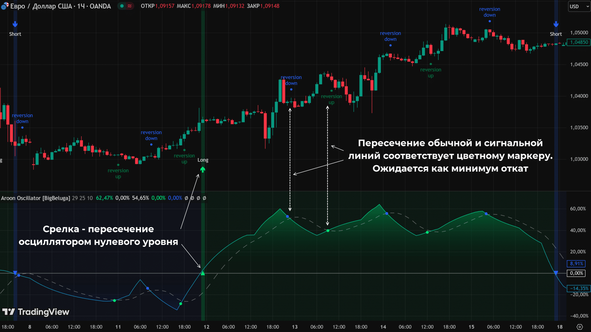 То, что в обычном индикаторе выглядит как пересечение линий на осцилляторе отображается как пересечение нулевой линии. Причем направление пересечения указывает на направление тренда. Aroon Oscillator можно назвать более дружелюбной версией стандартного индикатора.