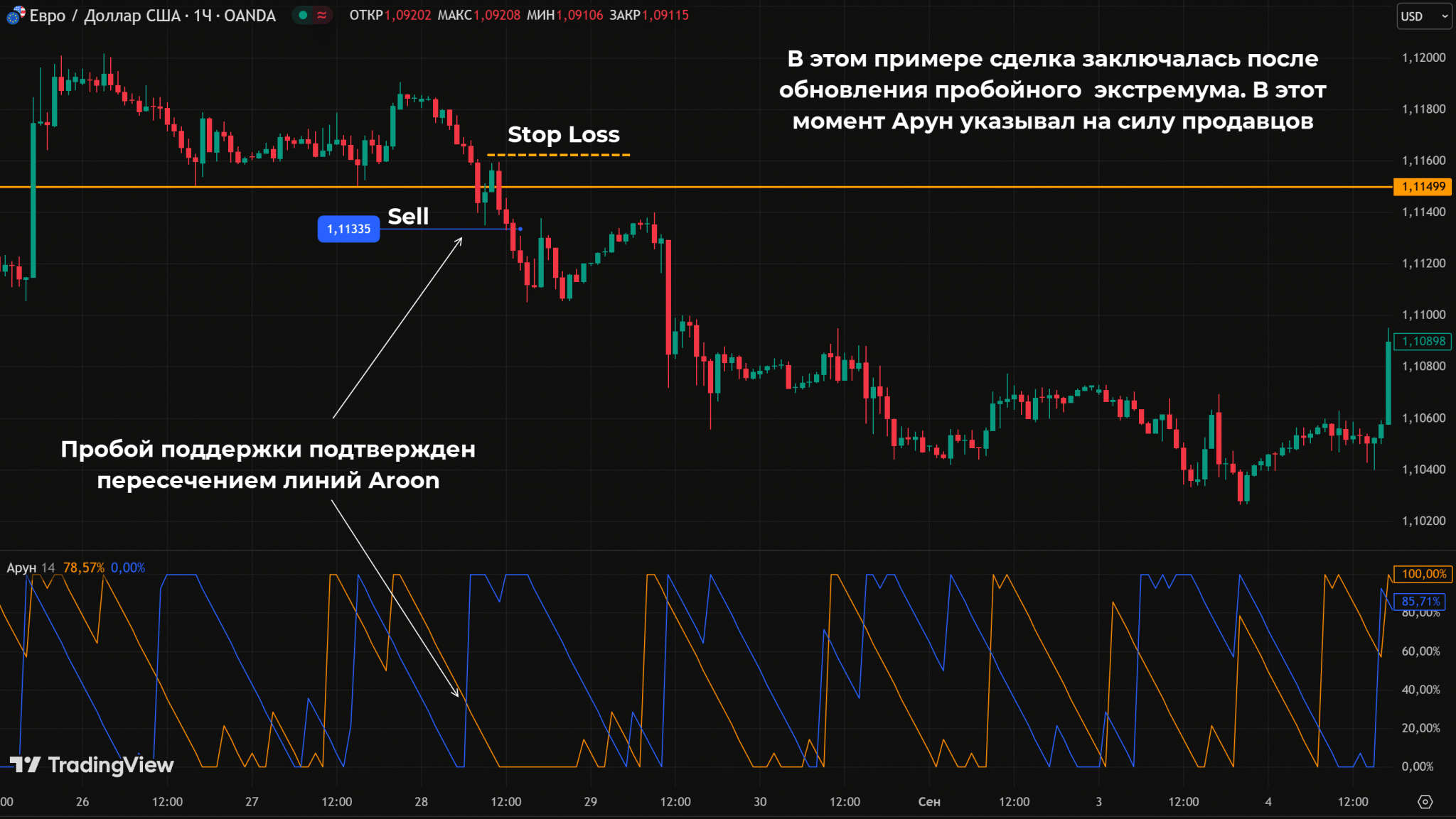 В примере выше возможность для торговли появилась при пробое поддержки. График находился в области максимумов, назревала значимая коррекция. При пробое поддержки Aroon Down пересеклась с Aroon Up.