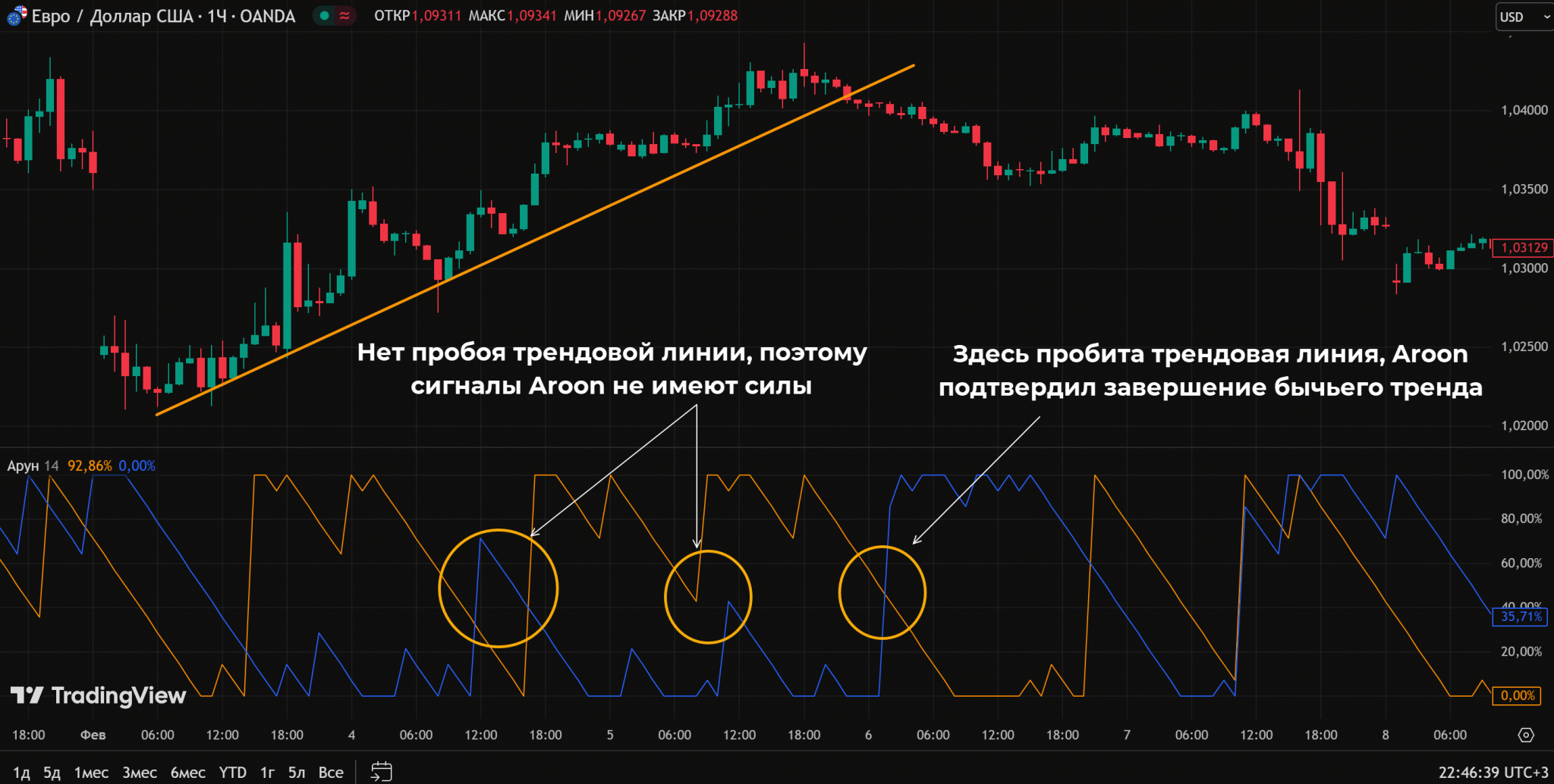 - Пересечения Up и Down линий индикатора. Например, пробой трендовой линии или уровня в сочетании с разворотным паттерном и сигналом от Aroon – неплохой сигнал для входа в рынок.