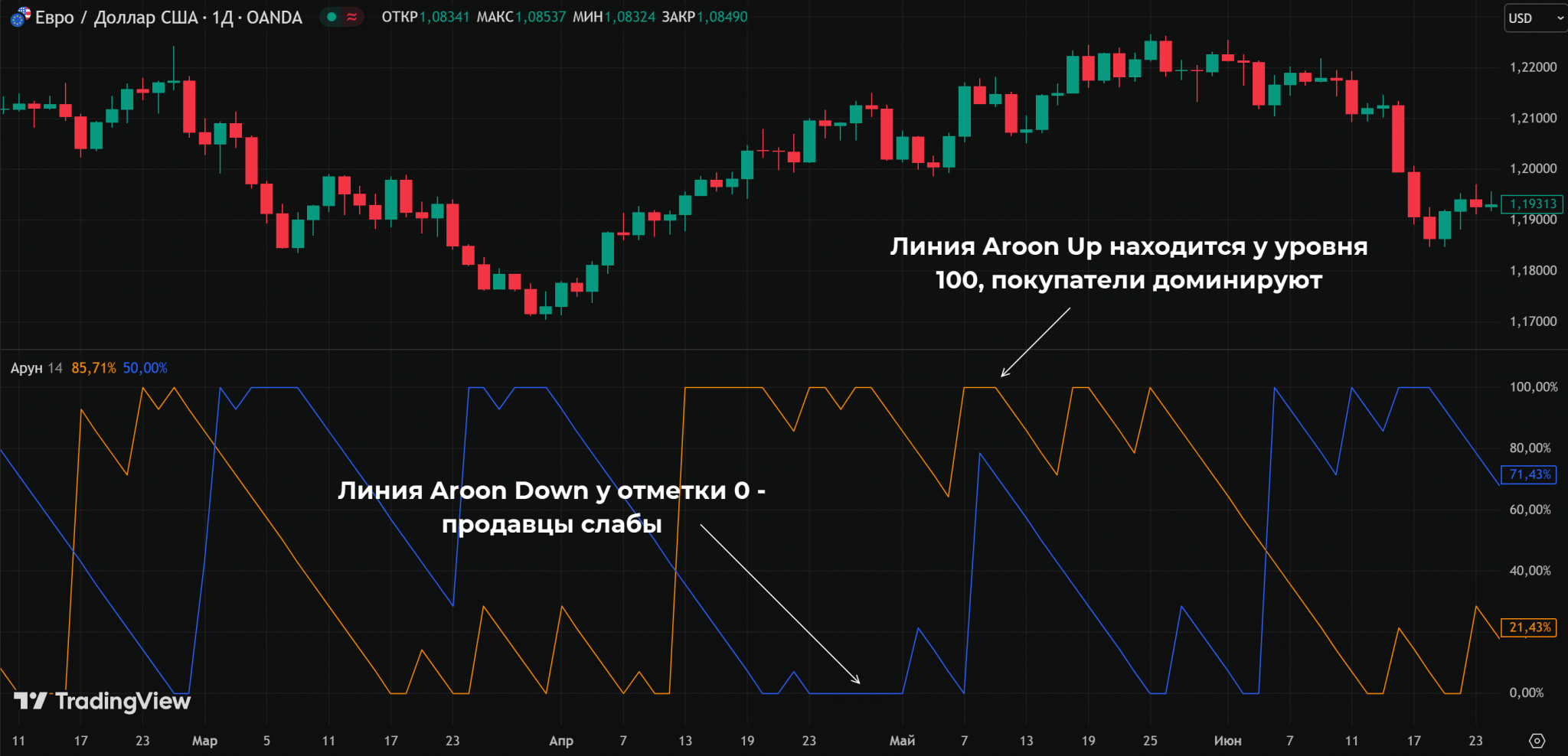 - Aroon Up и Aroon Down – линии, отвечающие за бычий и медвежий тренды соответственно.
