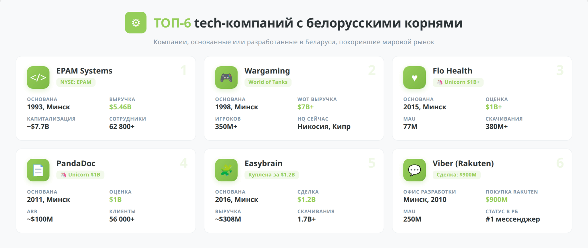 Иногда к числу Биг Техов относят компании не такой внушительной капитализации, но тоже занимающиеся передовыми технологиями, например, Alibaba, NVIDIA, Tesla, Paypal, Netflix, Taiwan Semiconductor. Беларусь, несмотря на компактный размер экономики, дала миру целый ряд заметных tech-компаний — от публичной корпорации EPAM до «единорогов» Flo Health и PandaDoc. Рассмотрим их подробнее.