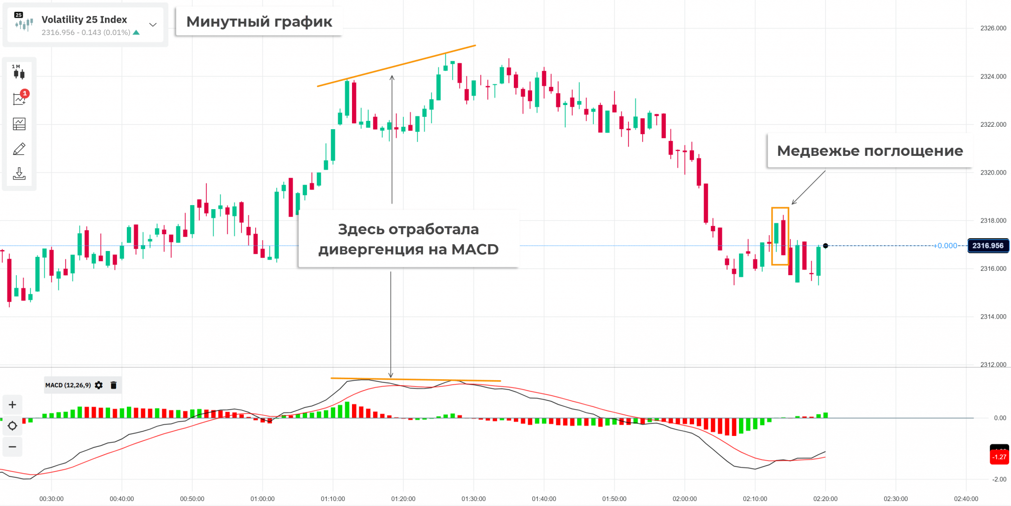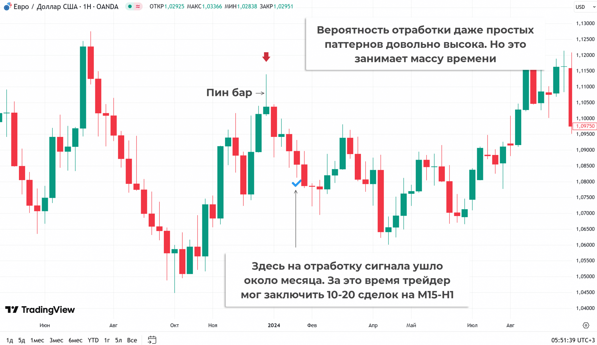 Формально здесь работают те же приемы, что и на крупных таймфреймах, но торговать намного сложнее. Отработка хуже, происходит за несколько минут.