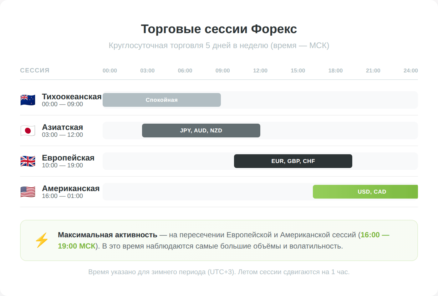 Торги на форексе ведутся в рабочие дни, круглосуточно. Но некоторые валютные пары могут быть недоступны – например, пары с белорусским рублём недоступны в ночное время по минскому часовому поясу.