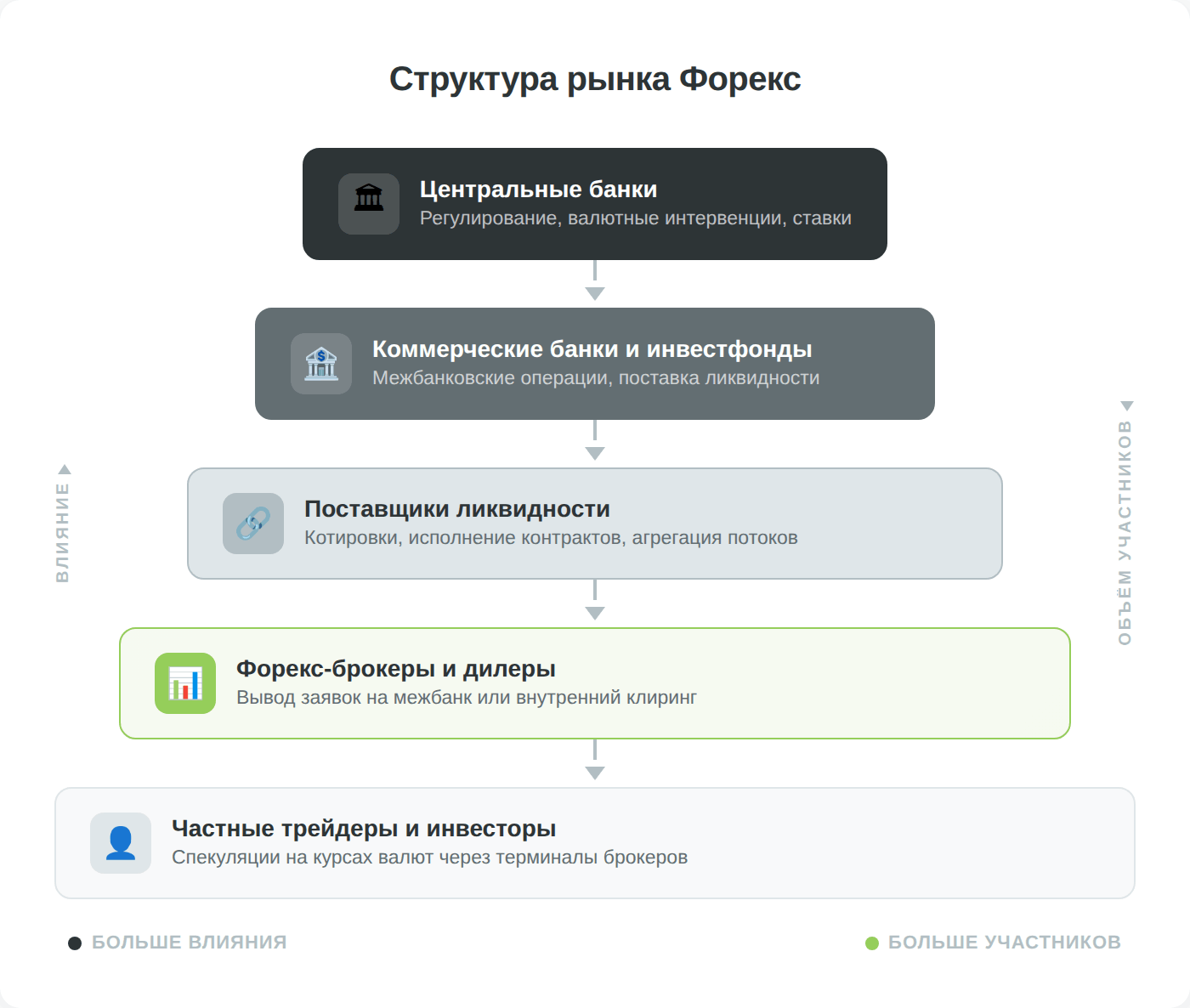 Поставщиками ликвидности выступают крупные банки, инвестфонды и другие подобные организации. Они не контролируют рынок, но могут повлиять на котировки.