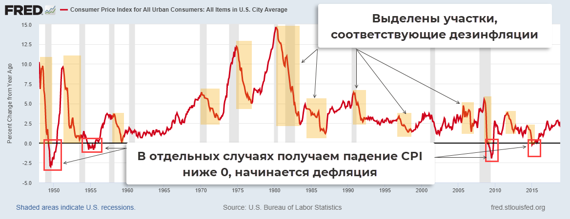 Если опираться на статистику, то дезинфляция происходит в несколько раз чаще по сравнению с дефляцией. Это логично, далеко не всегда снижение темпов роста длится настолько долго, чтобы CPI снизился ниже нулевого уровня.