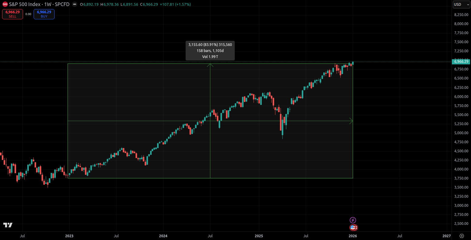 На начало 2026 года S&P 500 торгуется вблизи исторических максимумов — около 6,850 пунктов (данные на январь 2026). За 2024 год индекс прибавил порядка 23%, за 2025 — ещё около 20%. Такая серия — редкость: два подряд года с доходностью выше 20% случались лишь четыре раза за последние 50 лет. Возникает закономерный вопрос: не исчерпан ли потенциал роста?