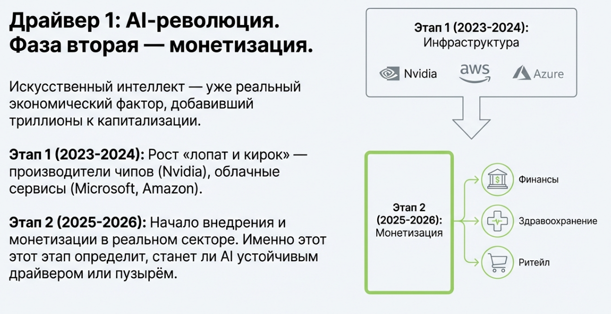 - Второй (2025-2026) — начало монетизации: компании, внедряющие AI для повышения эффективности и создания новых продуктов. Именно второй этап определит, превратится ли AI в устойчивый драйвер роста или останется очередным технологическим пузырём.