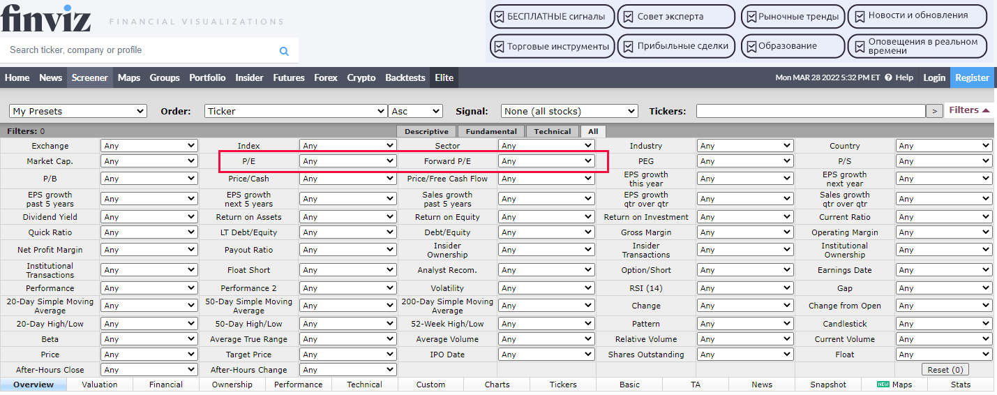 - Finviz. Здесь есть неплохой и бесплатный скринер, есть обычный и форвардный Price to Earnings. В скринере (более 60 фильтров в бесплатной версии) можно указывать параметры фильтрации, отсекая компании с не устраивающими значениями мультипликатора. Расширенные возможности — данные в реальном времени, около 70+ фильтров и собственные пользовательские фильтры — доступны только в платной подписке Finviz Elite (около $24,96 в месяц при оплате за год).