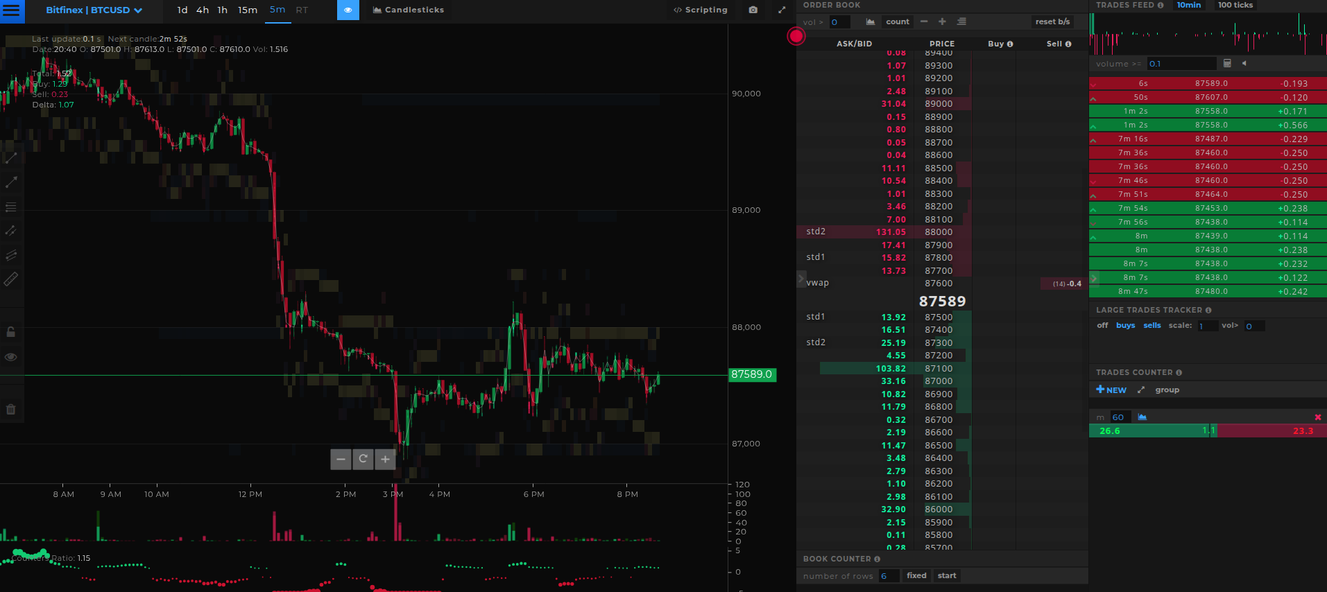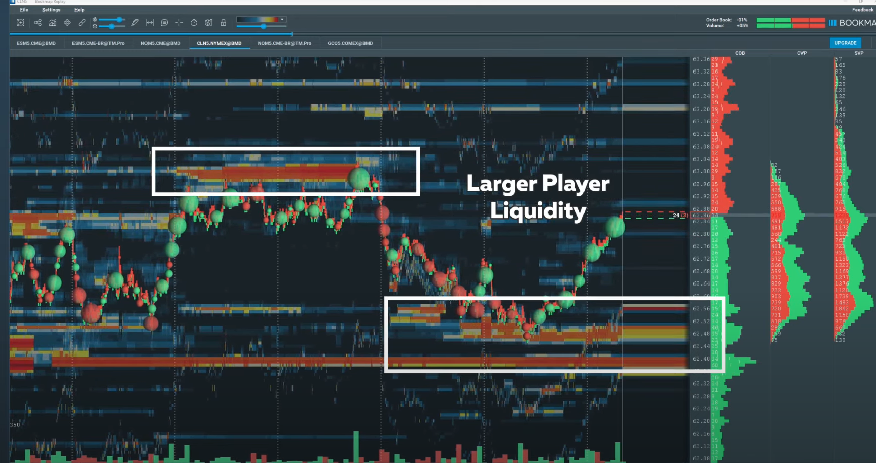 - Bookmap — индустриальный стандарт для визуализации ликвидности. Ключевая особенность — тепловая карта (heatmap), которая показывает не только текущий стакан, но и историю его изменений. Вы буквально видите, как ордера появлялись и исчезали во времени, что критически важно для выявления спуфинга. Платформа работает на 40 кадрах в секунду, поддерживает криптовалюты, фьючерсы и акции.