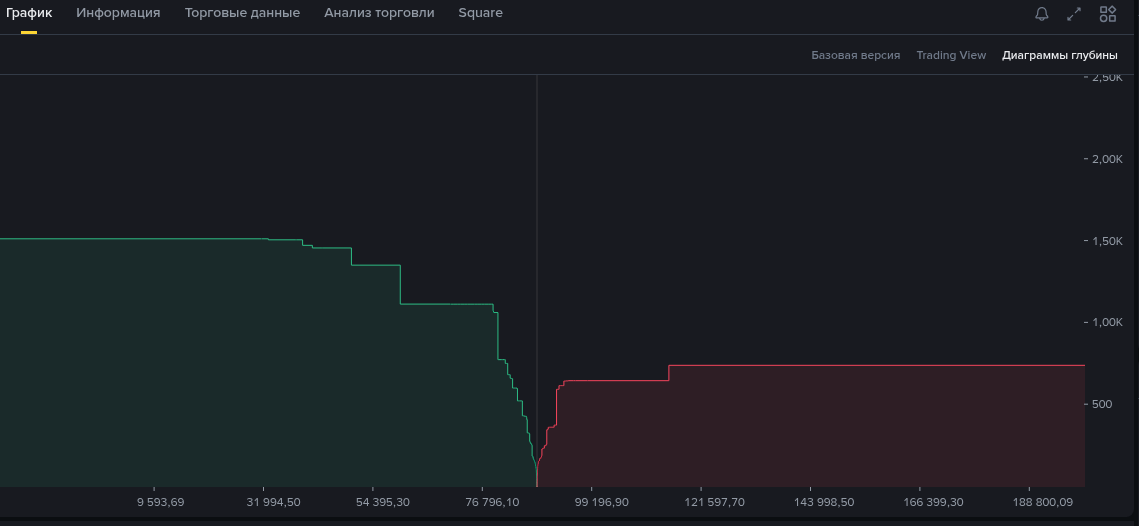 Большинство криптобирж предоставляют визуализацию глубины в виде графика с двумя кривыми — зелёной (bid) и красной (ask), — которые показывают совокупный объём ордеров по мере удаления от текущей цены. Горизонтальная ось — цена, вертикальная — совокупный объём. Точка пересечения двух кривых находится на уровне текущей рыночной цены (или, точнее, между лучшим bid и лучшим ask).