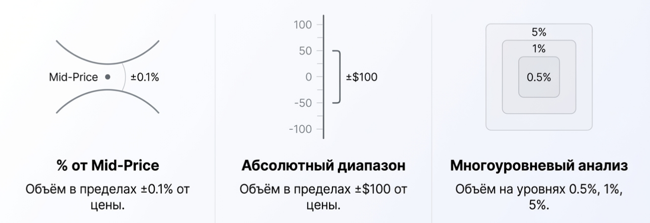 - Первый и наиболее распространённый метод — измерение совокупного объёма в пределах фиксированного процентного отклонения от mid-price (средней цены между лучшим bid и лучшим ask).