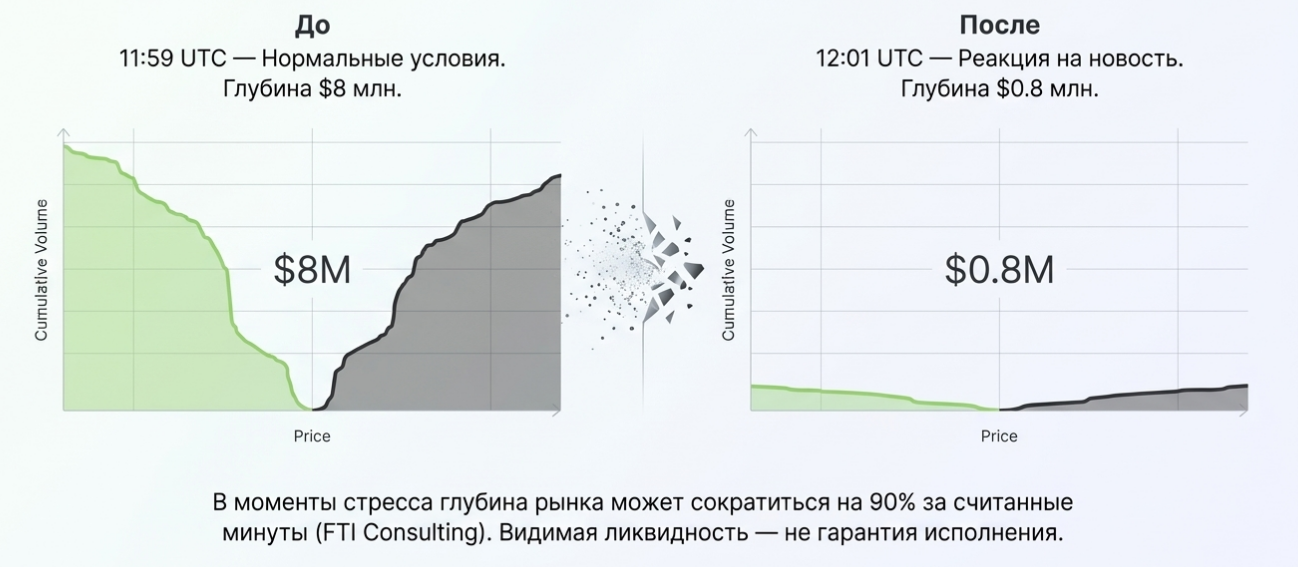 Это не гипотетический сценарий. Исследование FTI Consulting по октябрьскому краху 2025 года документирует именно такую динамику: глубина top-of-book на ключевых криптобиржах сократилась более чем на 90% за считанные минуты. Трейдеры, принимавшие решения на основе «нормальной» утренней глубины, к полудню оказались в совершенно другой рыночной среде — с расширенными спредами, испарившейся ликвидностью и каскадными ликвидациями.