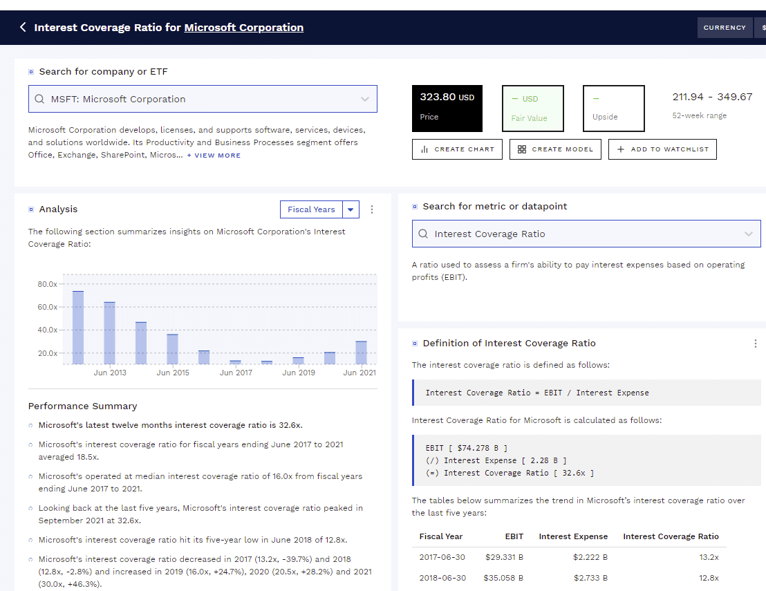 - Finbox. Удобный сервис, выбирается нужная компания и из выпадающего меню – нужный мультипликатор. Помимо значения ICR отображается его изменение на истории и изменение EBIT, выплат по долгам.
