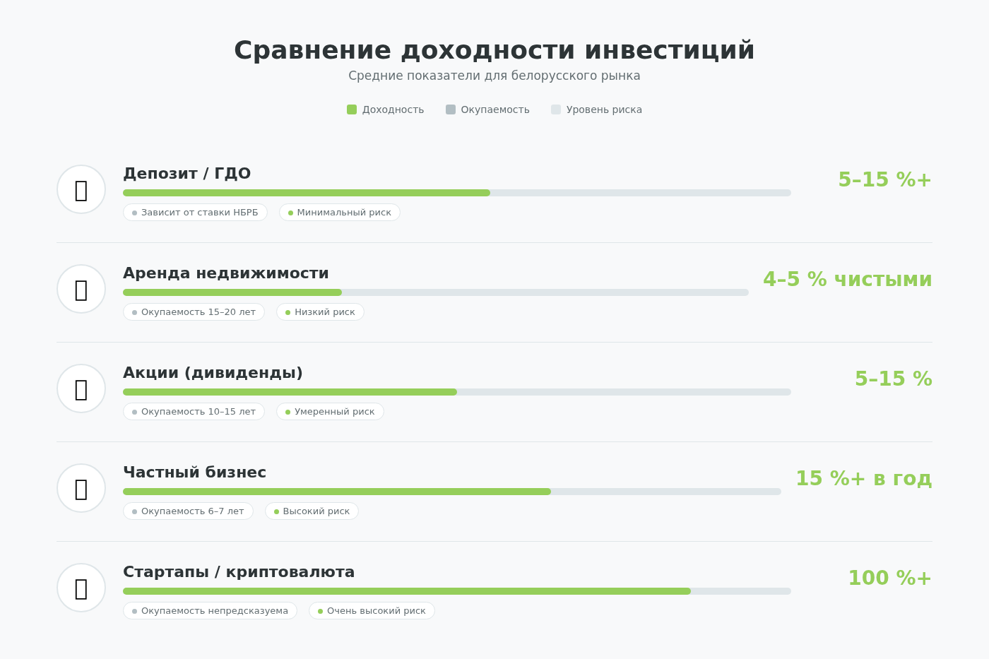 - Депозит в банке и облигации. Депозит в BYN даёт доходность, привязанную к ставке рефинансирования НБРБ (на март 2026 года — 9,75%). Безотзывные вклады предлагают 7,5–15% годовых в зависимости от банка и срока. При этом процентный доход по вкладам в BYN сроком более 1 года не облагается подоходным налогом. Нужно учитывать потери от инфляции (около 5–7% в год). Возьмём более надёжный вариант — государственные долговые обязательства (ГДО) с доходностью 5–9,5% годовых. Консервативно, но с защитой от обесценивания и поддержкой государства.