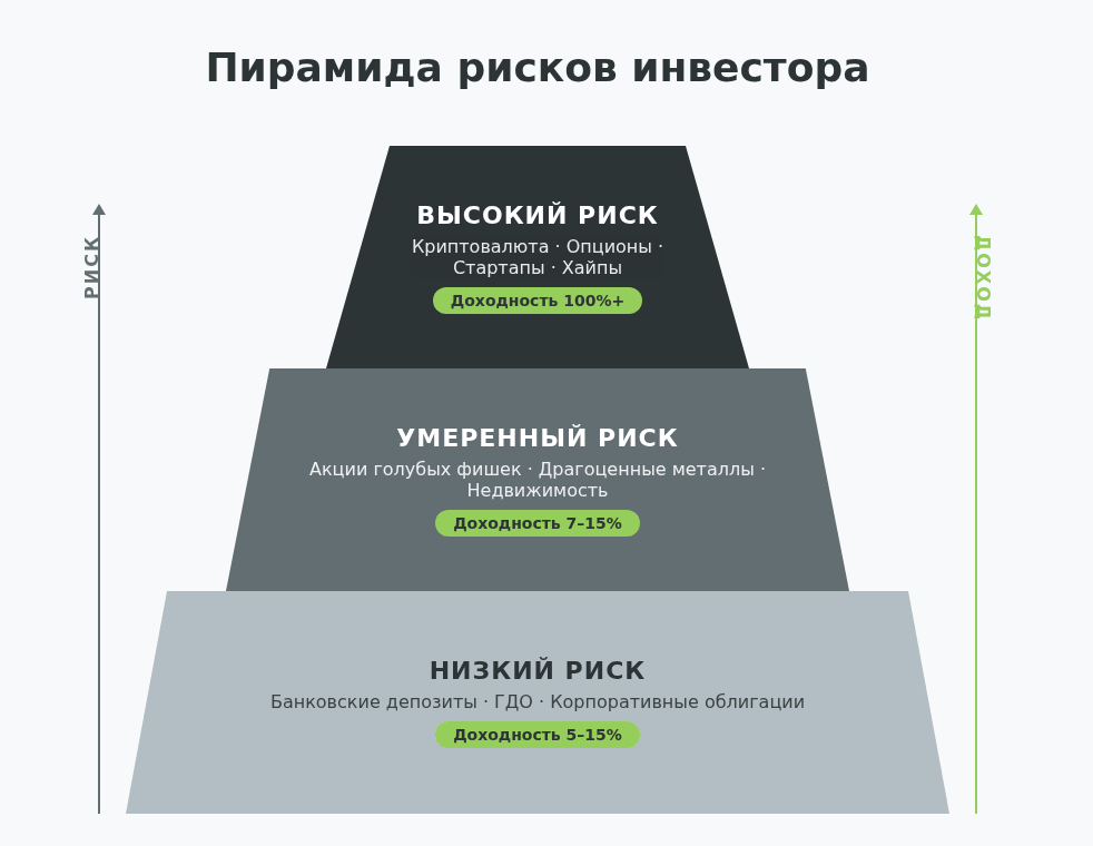 - Активы с высоким показателем риска. Это биржевые опционы, криптовалюта и вложения в бизнес. Конечно, бизнес может быть разным, но всё же мало кто из нас может действительно качественно и всесторонне изучить отрасль, чтобы сделать абсолютно правильные выводы, поэтому мы считаем его условно высокорискованным вложением денег. С криптовалютой чуть проще, но нужно проявлять терпение и закупаться понемногу. Ей свойственны достаточно масштабные колебания, выдержать которые может психика далеко не каждого инвестора. Ну и, конечно, есть множество разнообразных хайпов, пирамид и прочего. Это и инвестициями-то сложно назвать, скорее рулетка. Но есть люди, которые имеют особое чутьё и прямо вот в самый нужный момент выскакивают из таких проектов.