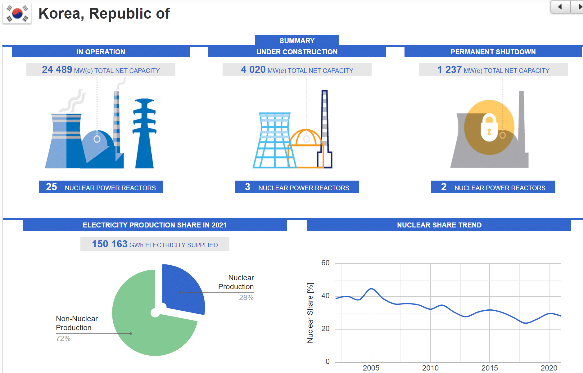 - Южная Корея. На дистанции с начала нулевых до начала 20-х годов доля АЭС снизилась с 40-45% до 28-30%, в моменте этот показатель снижался до 25%. Правительство утвердило план сохранения доли ядерной энергетики на уровне 30% до 2030 г. К 2036 г. ее доля должна возрасти до 34,6%. Ей отведена роль заменителя, планируется постепенно отходить от «грязных» источников энергии.