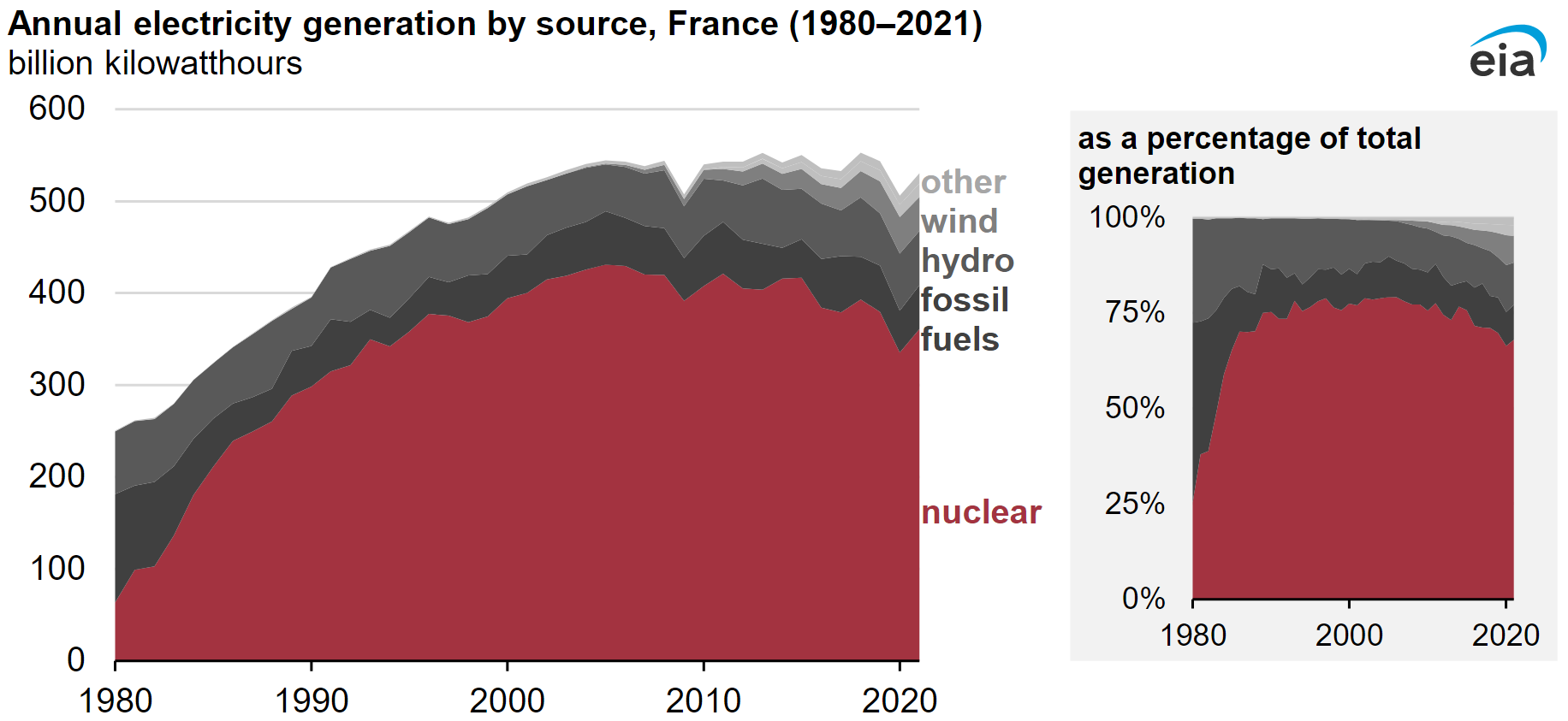- Франция. Из-за отсутствия крупных месторождений нефти, угля и газа Франция сделала ставку на атомную энергетику. В моменте доля этого компонента составляла до 75% от общего объема генерации в масштабе страны. В 2014 г. Олланд решил снизить долю АЭС в общей генерации до 50% к 2025 г., но этот план не сработал. В начале 2022 г. Макрон сообщил о строительстве 6 реакторов. Не исключено строительство еще 8 штук до 2050 г. Из-за периодической остановки их на обслуживание, доля ядерки снижается ниже 70%, но в остальном остается стабильной.