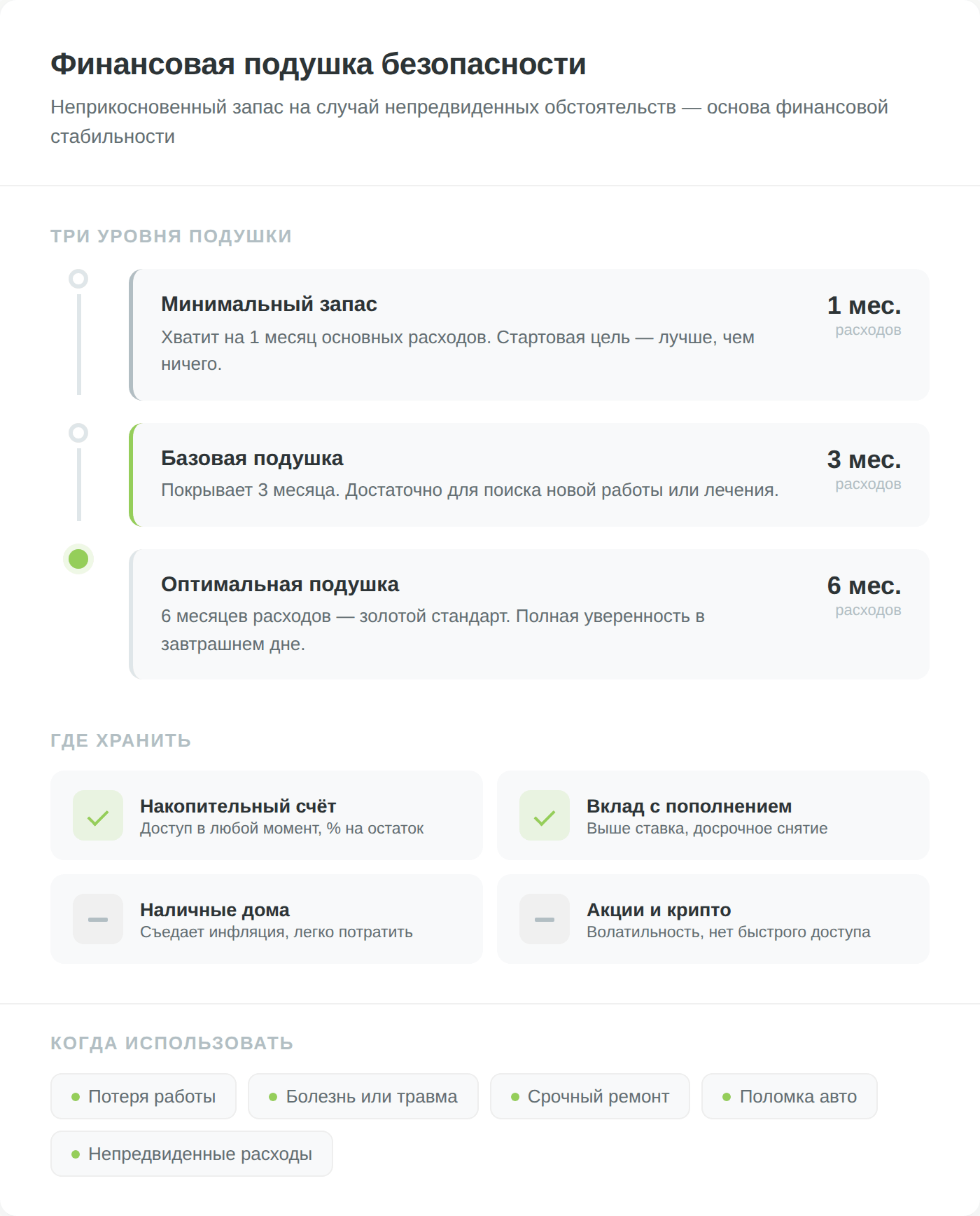 Оптимальный размер финансовой подушки — 3-6 месячных расходов семьи. Это позволит вам чувствовать себя спокойно в случае форс-мажоров: потеря работы, болезнь, срочный ремонт квартиры или машины.