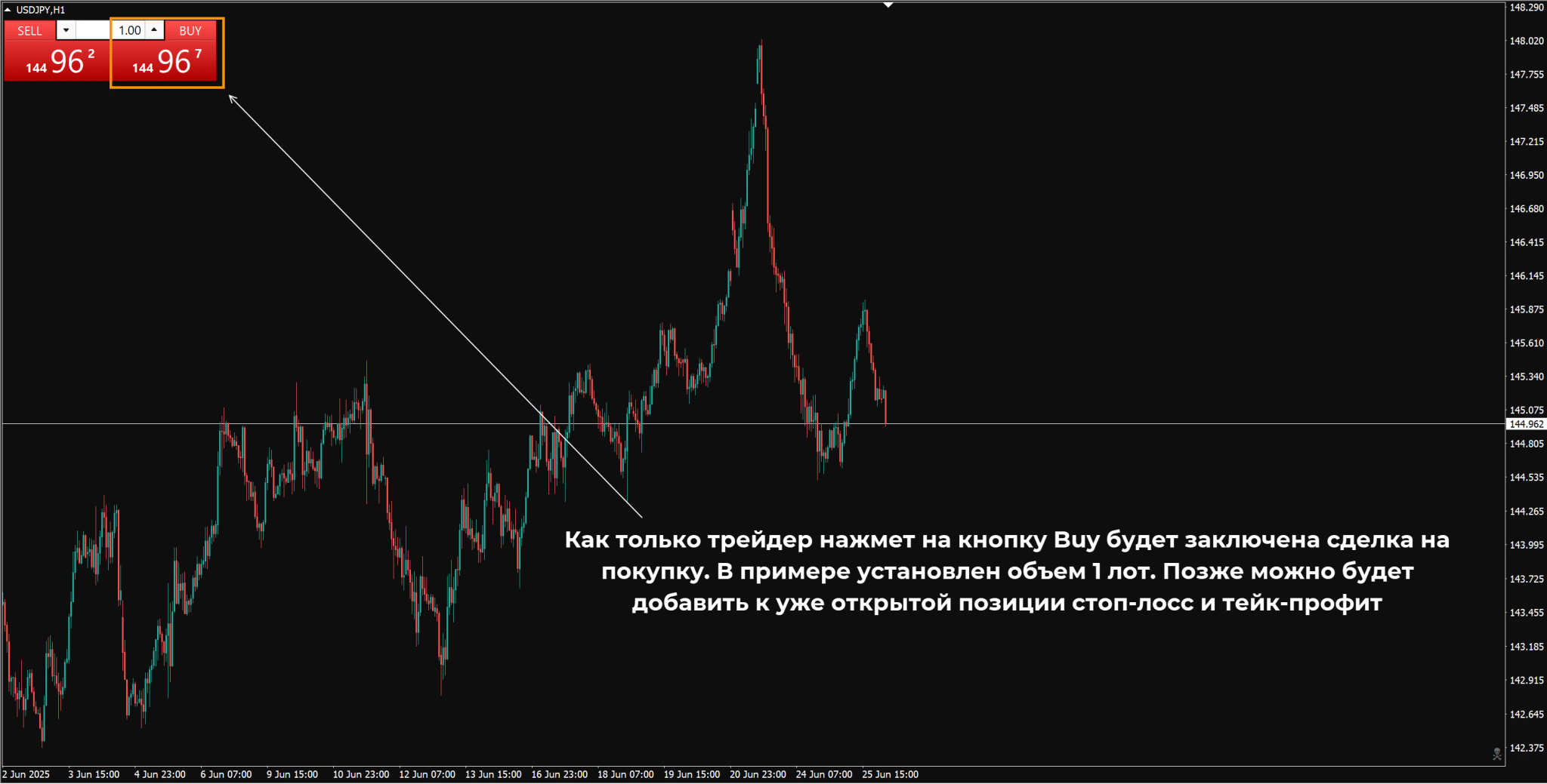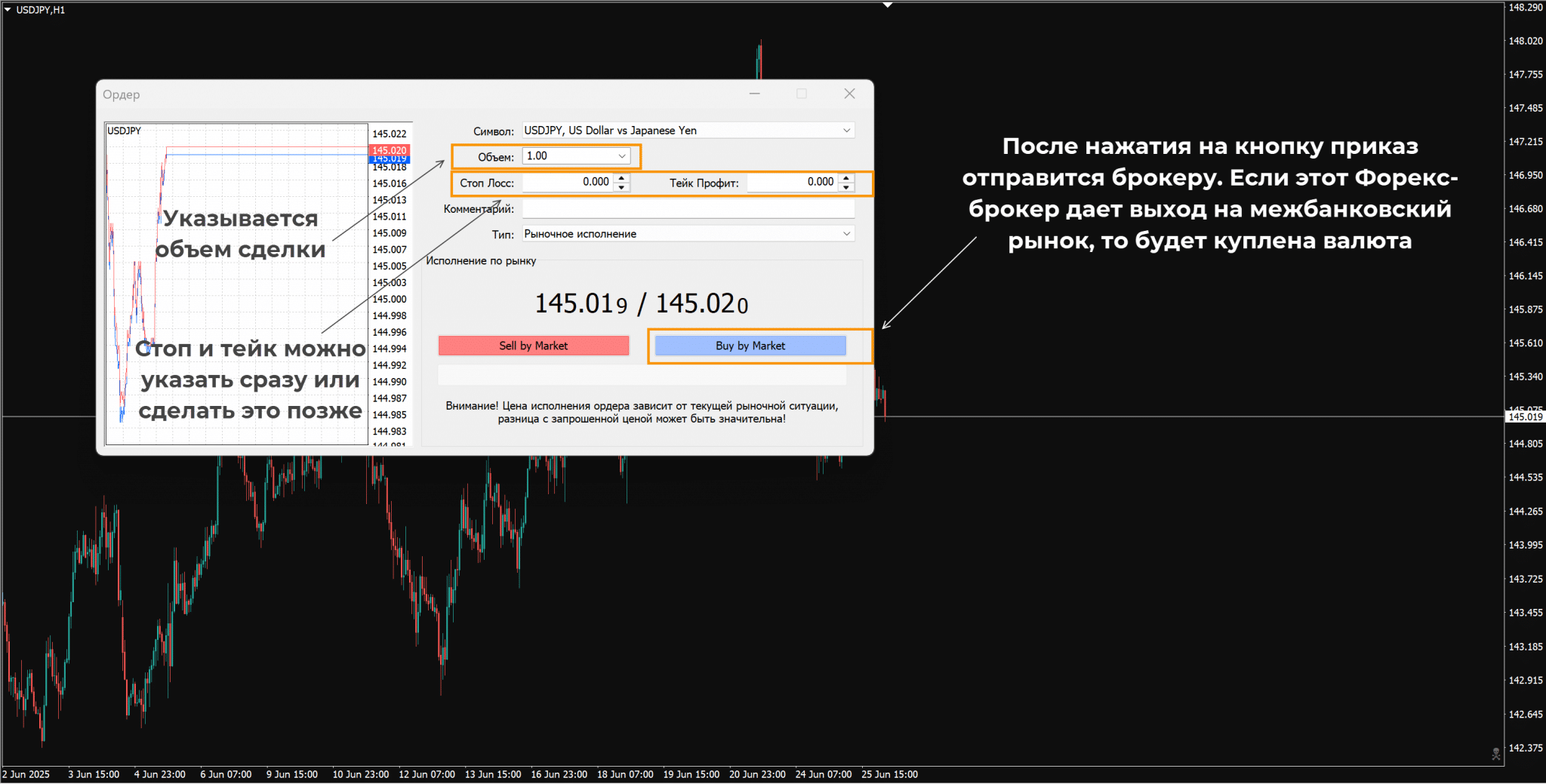 В общих чертах порядок действий остается без изменений независимо от рынка. Трейдеру нужно задать объем позиции, выбрать направление торговли и отправить приказ. При необходимости указывается стоп-лосс и тейк-профит.