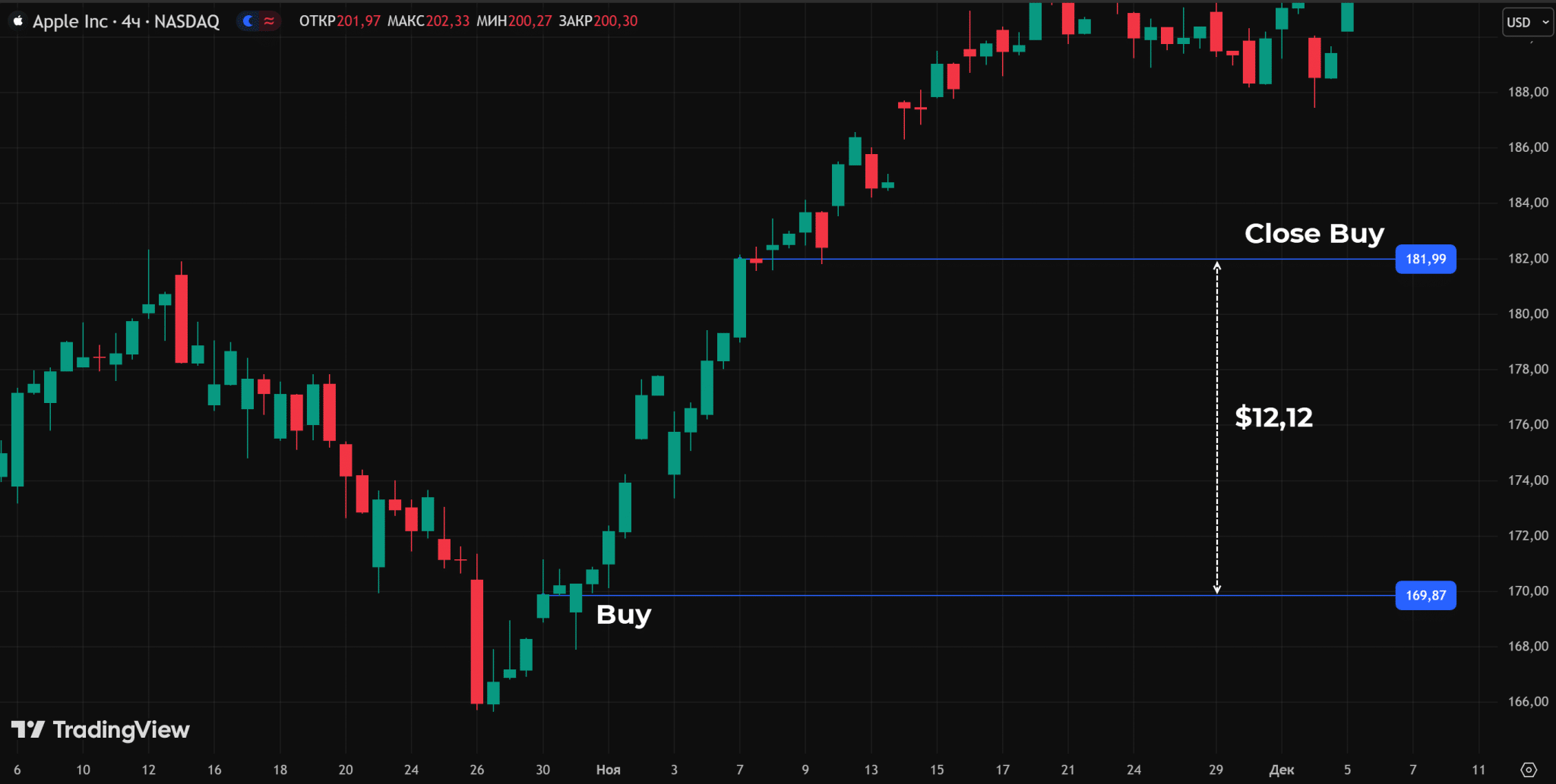 - Прибыль составила $181,99 — $169,87 = $12,12. Если бы трейдер покупал 10 акций, то на этой сделке заработал бы $121,20.