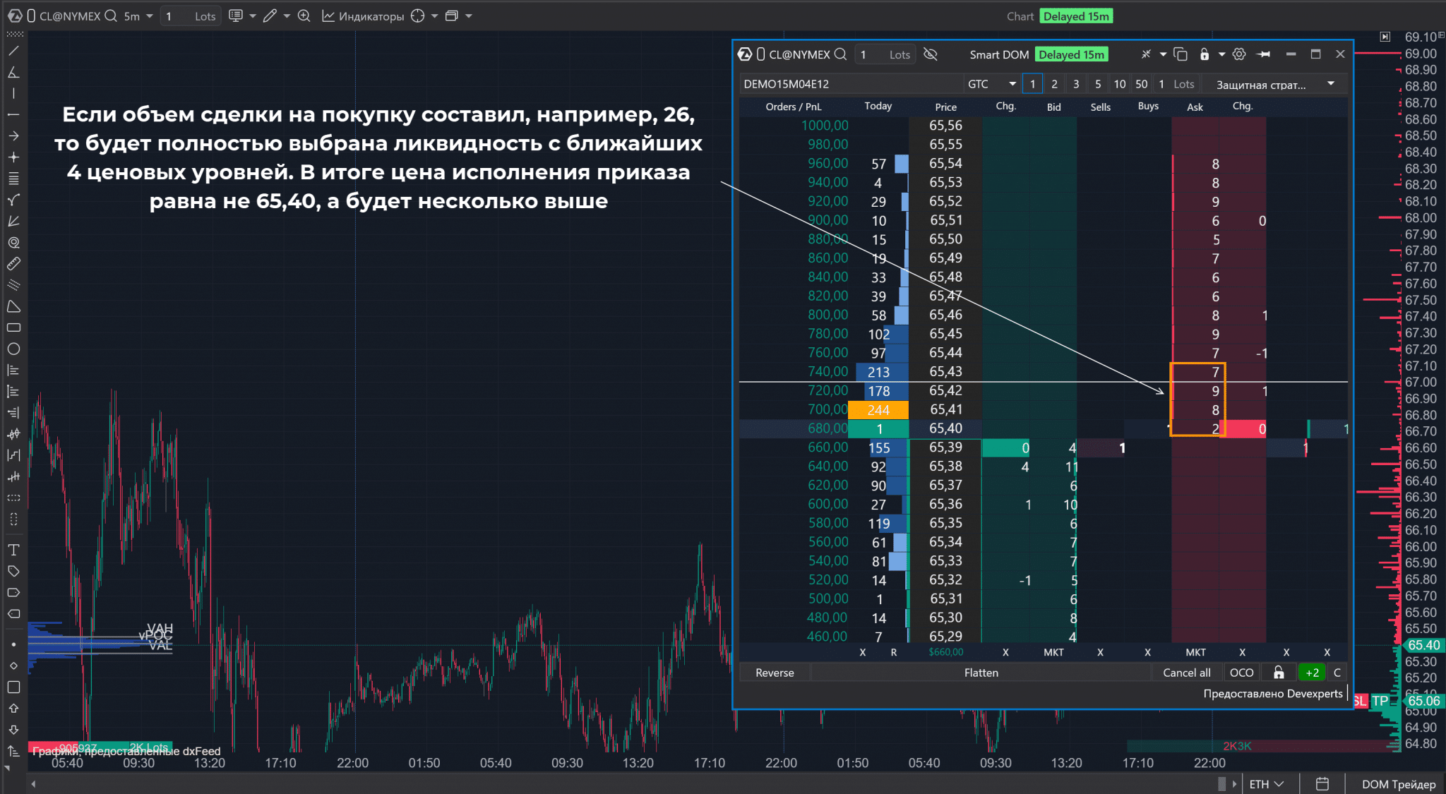 - Есть предложение со стороны продавцов, но объем заявки покупателя слишком велик. Приказ исполняется, но цена исполнения будет отличаться от Ask, который отображается в терминале. Поглощается ликвидность с нескольких уровней, цена будет несколько хуже.