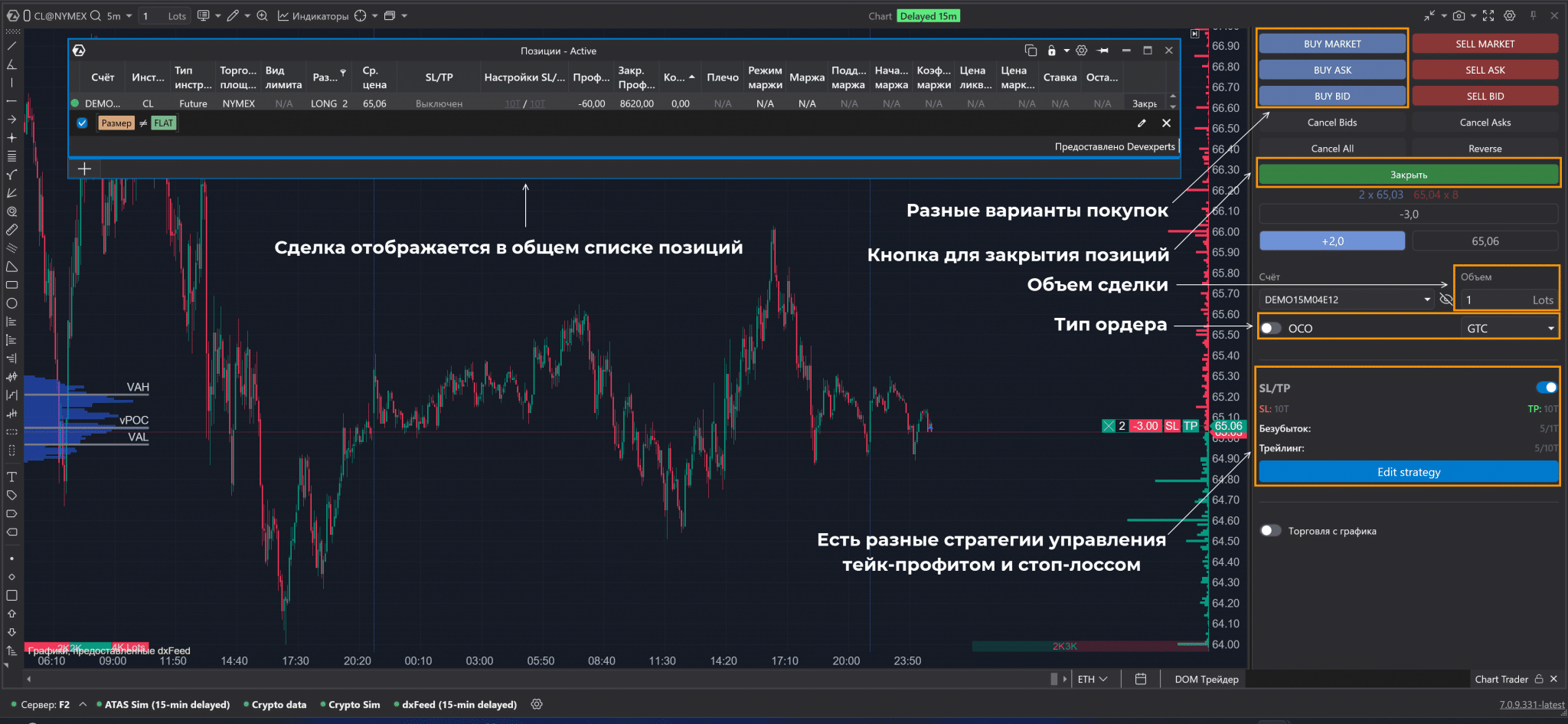 - Также задается объем позиции. Можно указать положение стоп-лосса и тейк-профита.