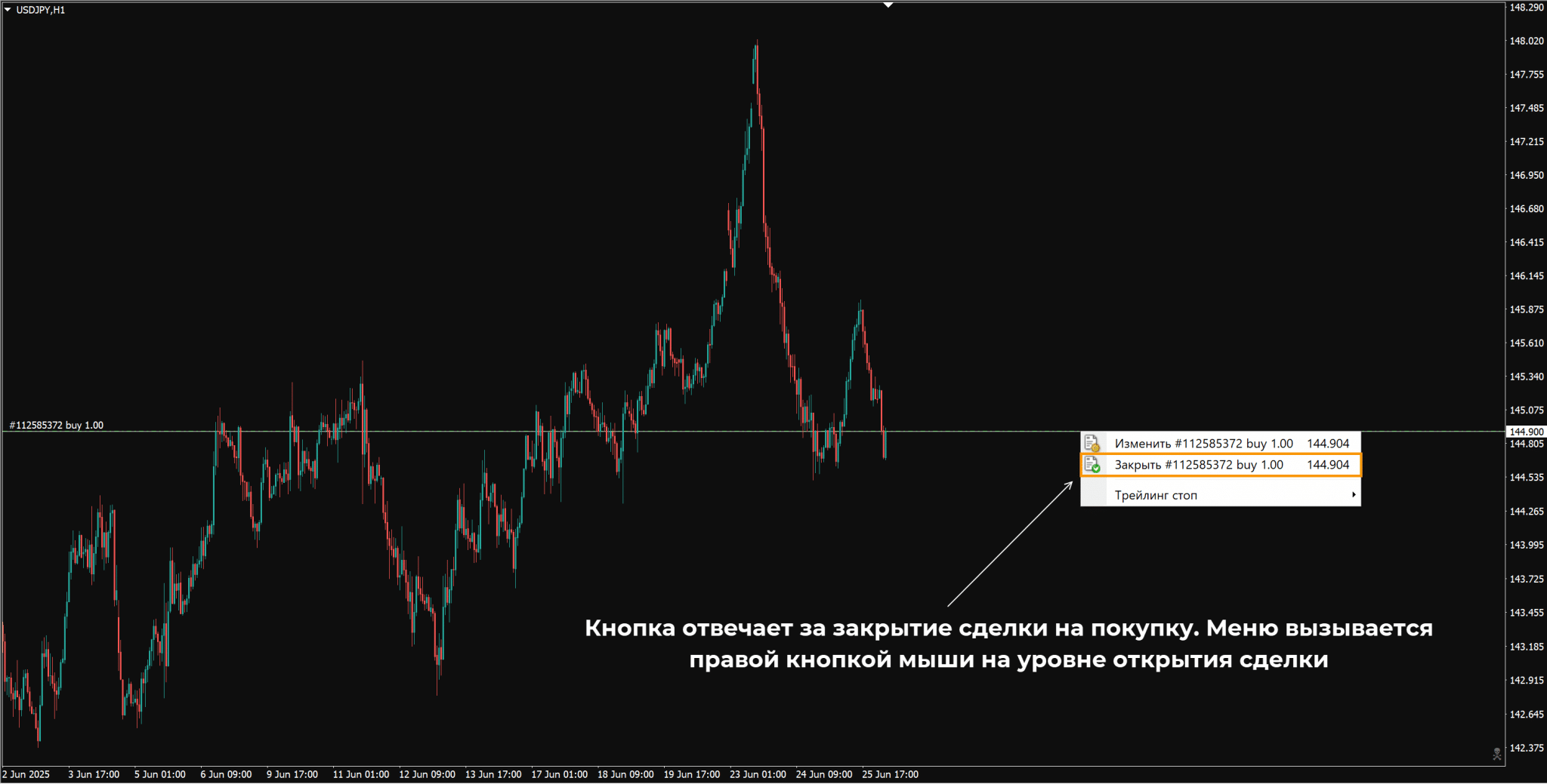 - Выбрав соответствующий пункт в контекстном меню. Его можно вызвать, нажав правой кнопкой мыши на уровне открытия сделки на графике.