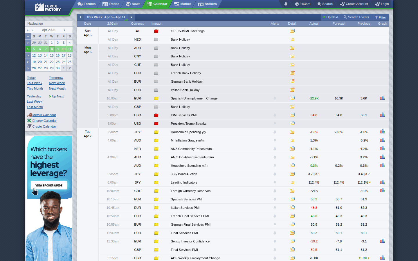 - ForexFactory. Это не только популярный форум, на котором выкладываются десятки индикаторов и советников, но и источник данных по основным макроэкономическим индикаторам. Есть все необходимые фильтры, можно настроить временную зону, чтобы время выхода статистики указывалось в удобном для вас формате. Как и на Investing.com доступно отображение данных в виде графика.
