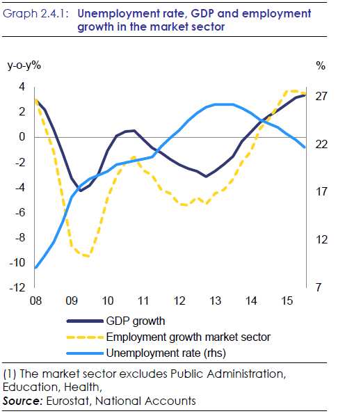 Между ВВП и занятостью есть прямая зависимость. Между безработицей и ВВП наблюдается устойчивая обратная корреляция. График на рисунке ниже показывает эти зависимости.