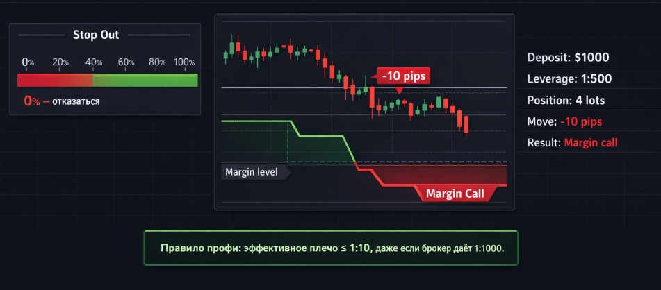Также следите за загрузкой депозита. Высокое плечо (например, 1:500) — это ловушка. Оно позволяет открыть сделку объемом в 4 лота на $1000, но движение цены всего на 10 пунктов против вас приведет к маржин-коллу.