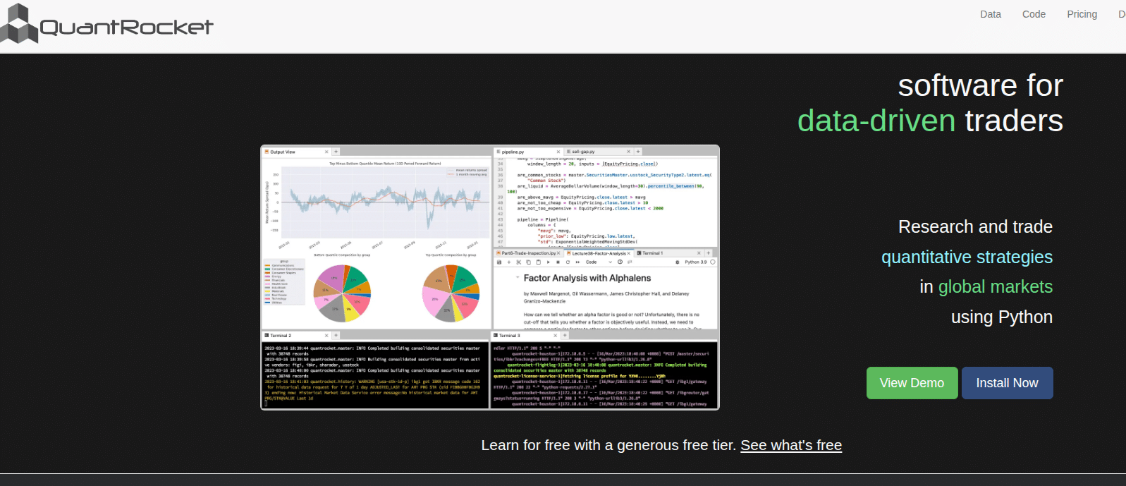 - QuantRocket — полнофункциональная Python-платформа для квант-трейдинга, поддерживает ML через scikit-learn, Keras/TensorFlow и XGBoost, работает с альтернативными данными. Стоимость от $19.99/месяц (зависит от типа лицензии).