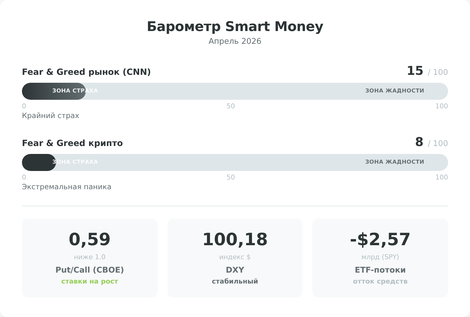 - Put/Call (CBOE): 0,59 на 2 апреля — ниже 1,0 означает, что колл-опционов (ставки на рост) больше, чем путов (ставки на падение). Это расхождение с индексами страха: крупные игроки начинают делать ставки на отскок, пока розничные инвесторы паникуют.