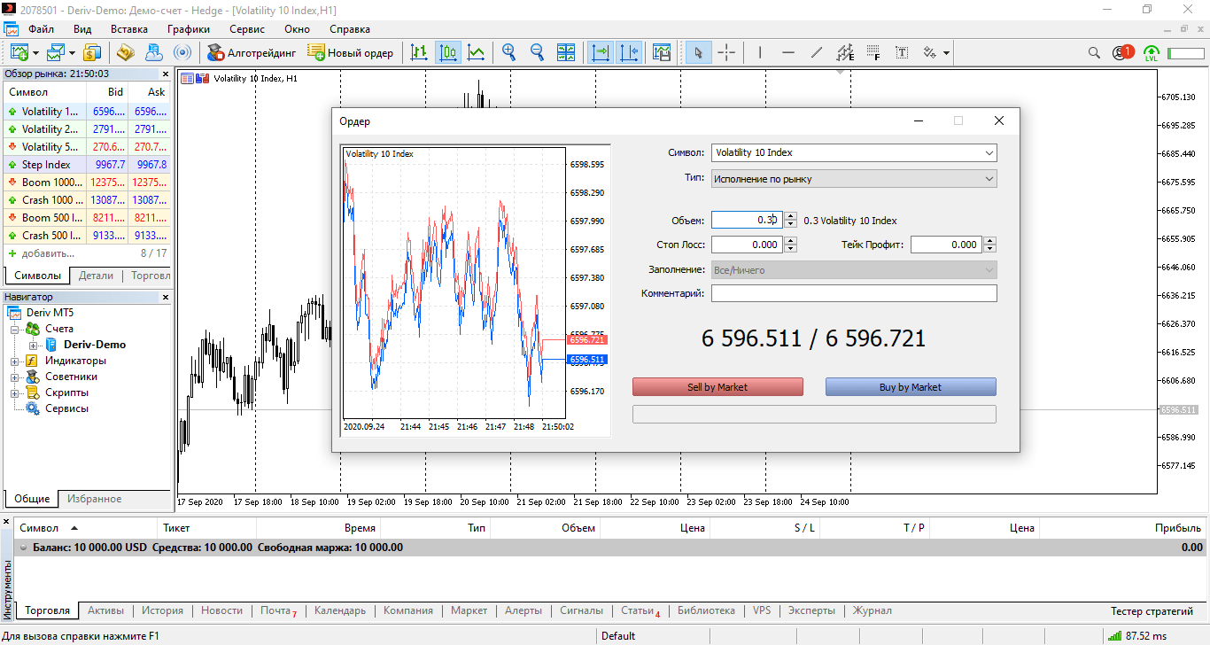 Одна из сильных сторон Deriv — возможность начать знакомство с платформой без единого вложенного доллара. Демо-аккаунт доступен сразу после базовой регистрации и не требует ни верификации личности, ни внесения депозита. Это логичный первый шаг для любого трейдера, независимо от уровня опыта.