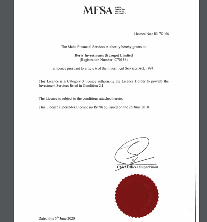 - MFSA — Malta Financial Services Authority (Мальта). Это самый «тяжеловесный» регулятор в портфеле Deriv. MFSA — это Tier-1 регулятор, входящий в систему финансового надзора Европейского Союза. Мальтийская лицензия (номер IS/70156) принадлежит компании Deriv Investments (Europe) Limited. Что это значит на практике? Клиенты, обслуживаемые через мальтийское юрлицо, получают европейский уровень защиты: сегрегация клиентских средств, соблюдение антиотмывочного законодательства (AML), доступ к Мальтийской схеме компенсации инвесторов (до 90% от суммы, максимум €20 000).