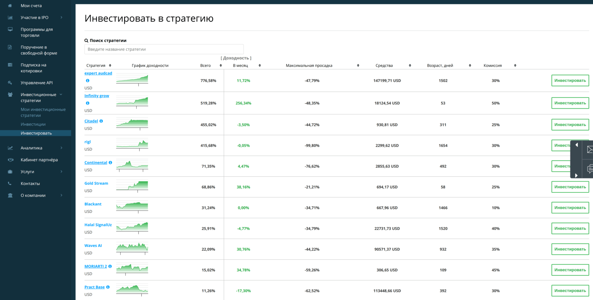 Механика стандартная: вы выбираете управляющего из списка доступных стратегий, анализируете его историю торговли (доходность, просадки, стаж), подключаетесь и ждёте результата. Управляющий берёт комиссию — обычно 20–50% от прибыли, точные условия зависят от конкретной стратегии. Ваши средства остаются на вашем счёте — управляющий не имеет прямого доступа к ним и не может их вывести, что защищает от мошенничества.