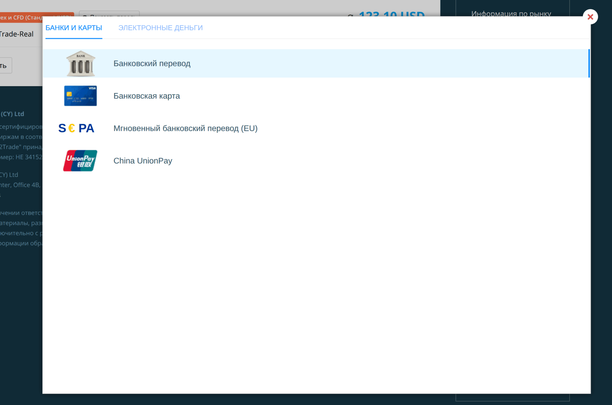 China UnionPay (CUP) доступен для пополнения и вывода в Just2Trade. При пополнении комиссия 2.5% компенсируется брокером, при выводе — 0%. Валюта — CNY (китайский юань).