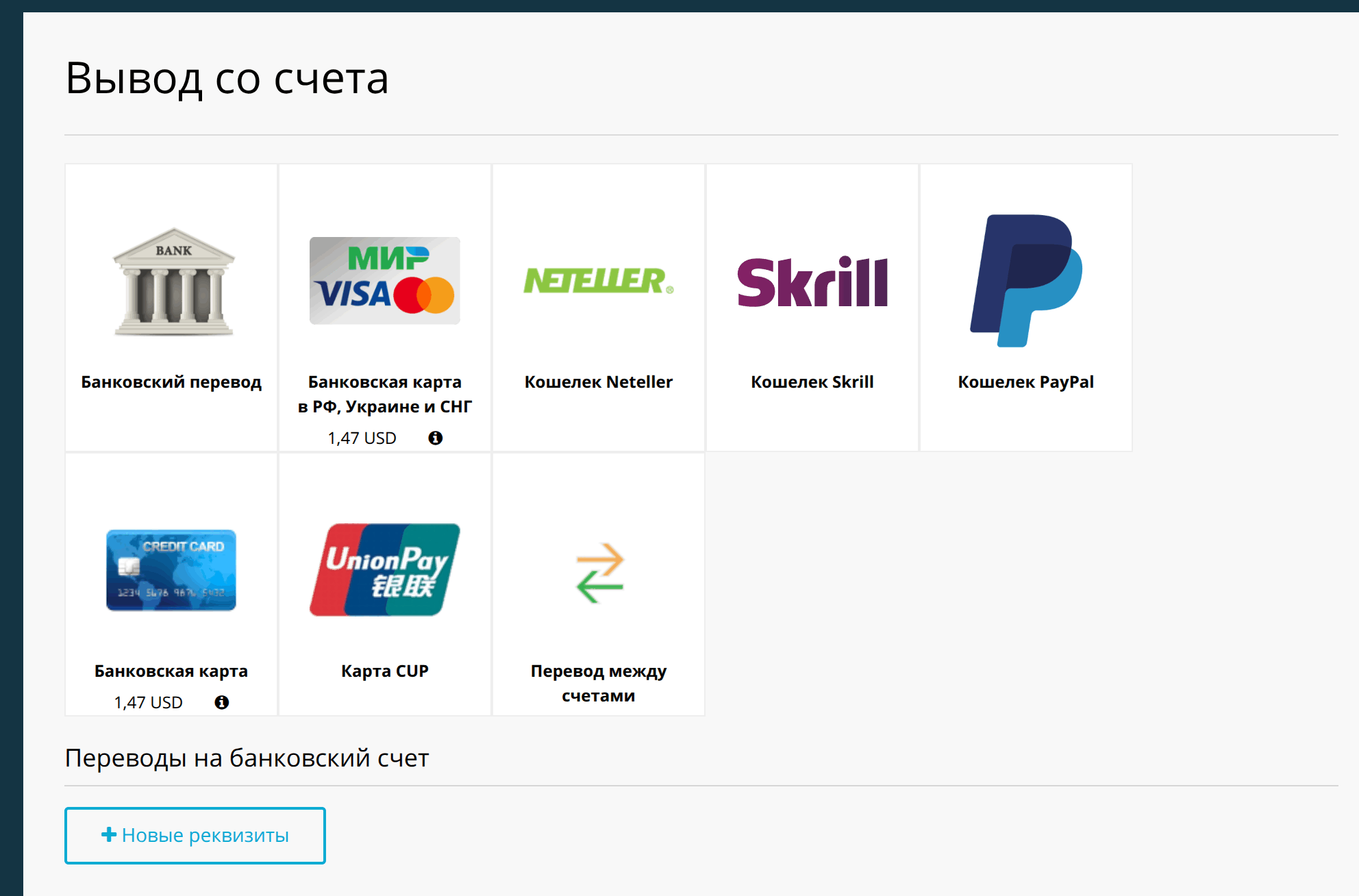 | Валюты счёта | USD, EUR, RUB | USD, EUR, RUB | USD, EUR, RUB | USD, EUR, RUB |