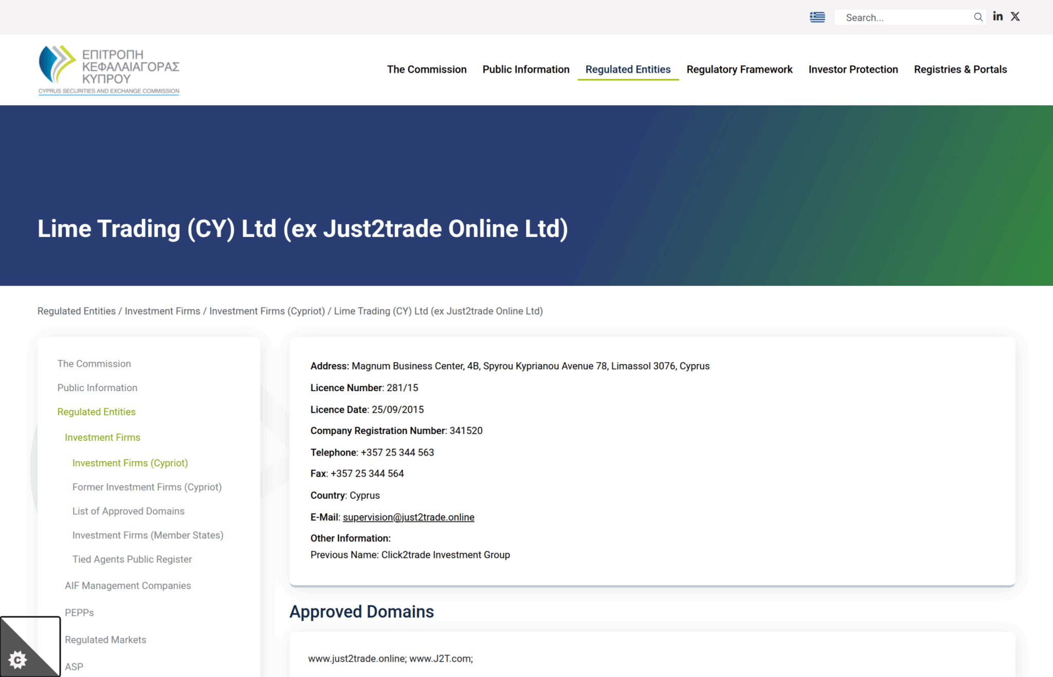 Lime Trading (CY) Ltd — юридическое лицо, стоящее за брендом Just2Trade — имеет действующую лицензию Кипрской комиссии по ценным бумагам и биржам (CySEC, №281/15 от 25 сентября 2015 года). Проверить это может любой желающий: достаточно зайти на сайт CySEC, найти раздел «Investment Firms (Cypriot)» и ввести название компании. В реестре отображается статус «Active», что подтверждает действительность лицензии на текущую дату.