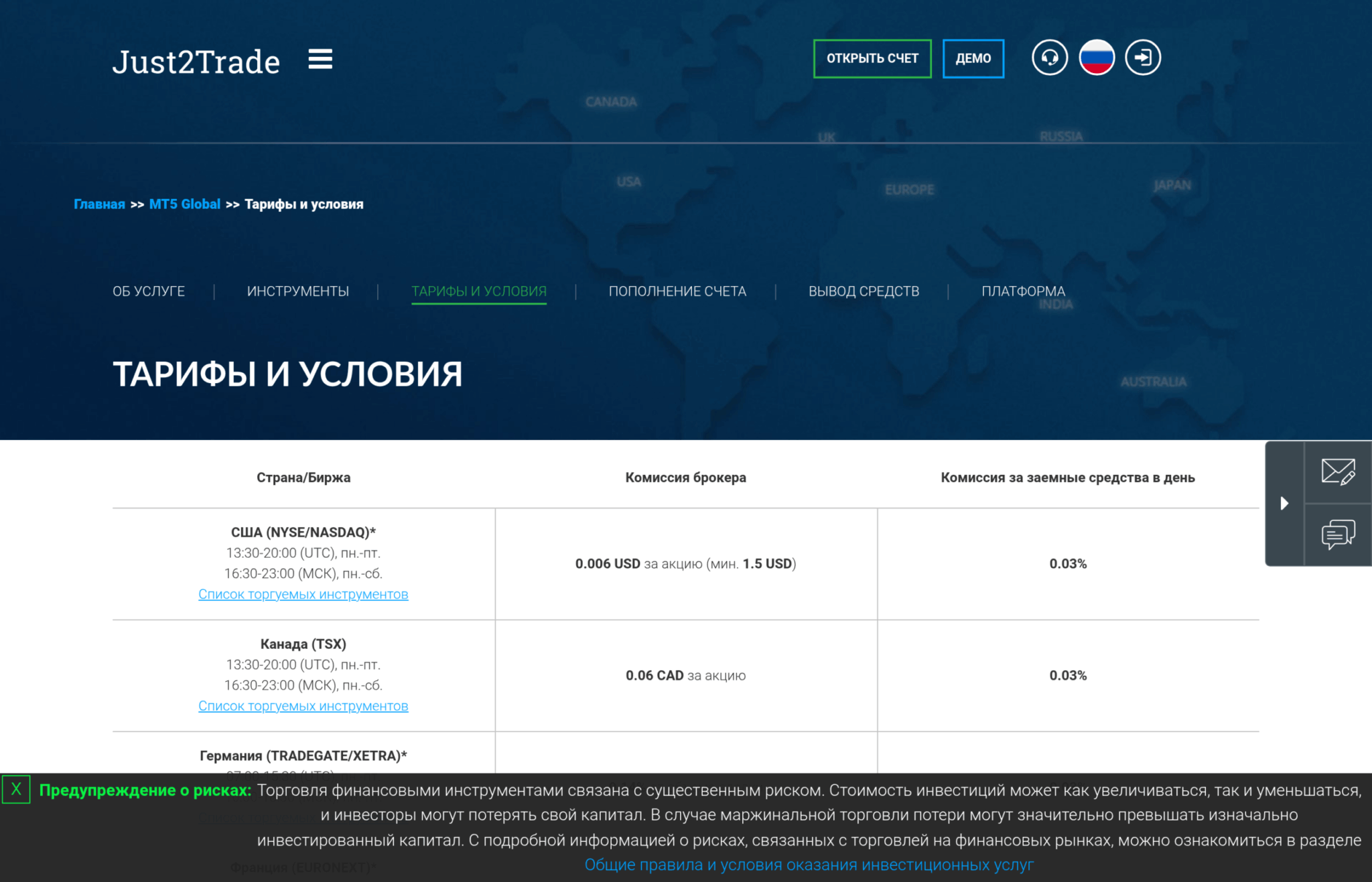 Это, пожалуй, самая сильная сторона Just2Trade и главное, что отличает его от типичных форекс-брокеров. Через счёт MT5 Global можно покупать реальные акции (с поставкой, а не CFD) на следующих биржах:
