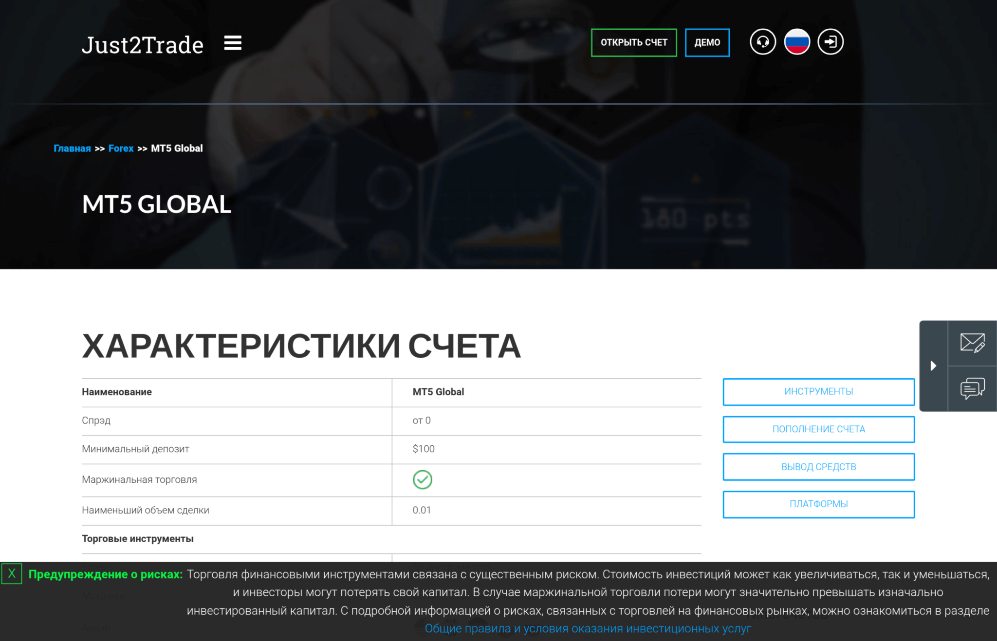 Минимальный депозит — $100, спреды по форексу от 0.0 пункта, комиссия — $2 за лот по валютным парам. По акциям и другим биржевым инструментам комиссии зависят от конкретной биржи и типа актива (подробнее — в разделе о тарифах). Платформа — MetaTrader 5, более современная и функциональная версия MT4 с поддержкой стакана цен (Level II), встроенным экономическим календарём и возможностью одновременной торговли на разных рынках.