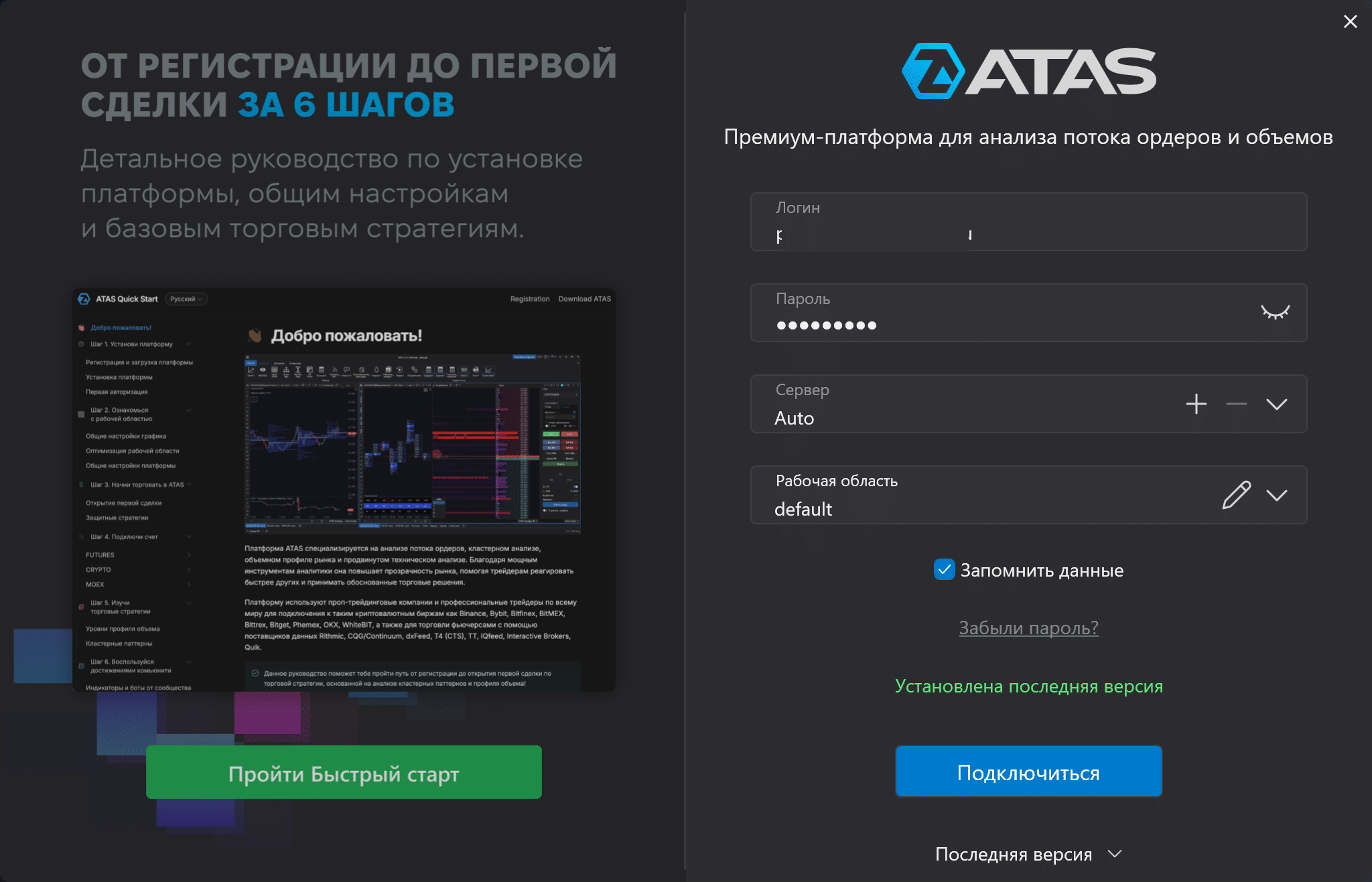 ATAS – это просто платформа, для торговли нужно иметь брокерский счет и подключиться к нему. Поддерживаются все популярные криптобиржи, также есть возможность подключать Quik, МТ5, Transaq Connector счета.