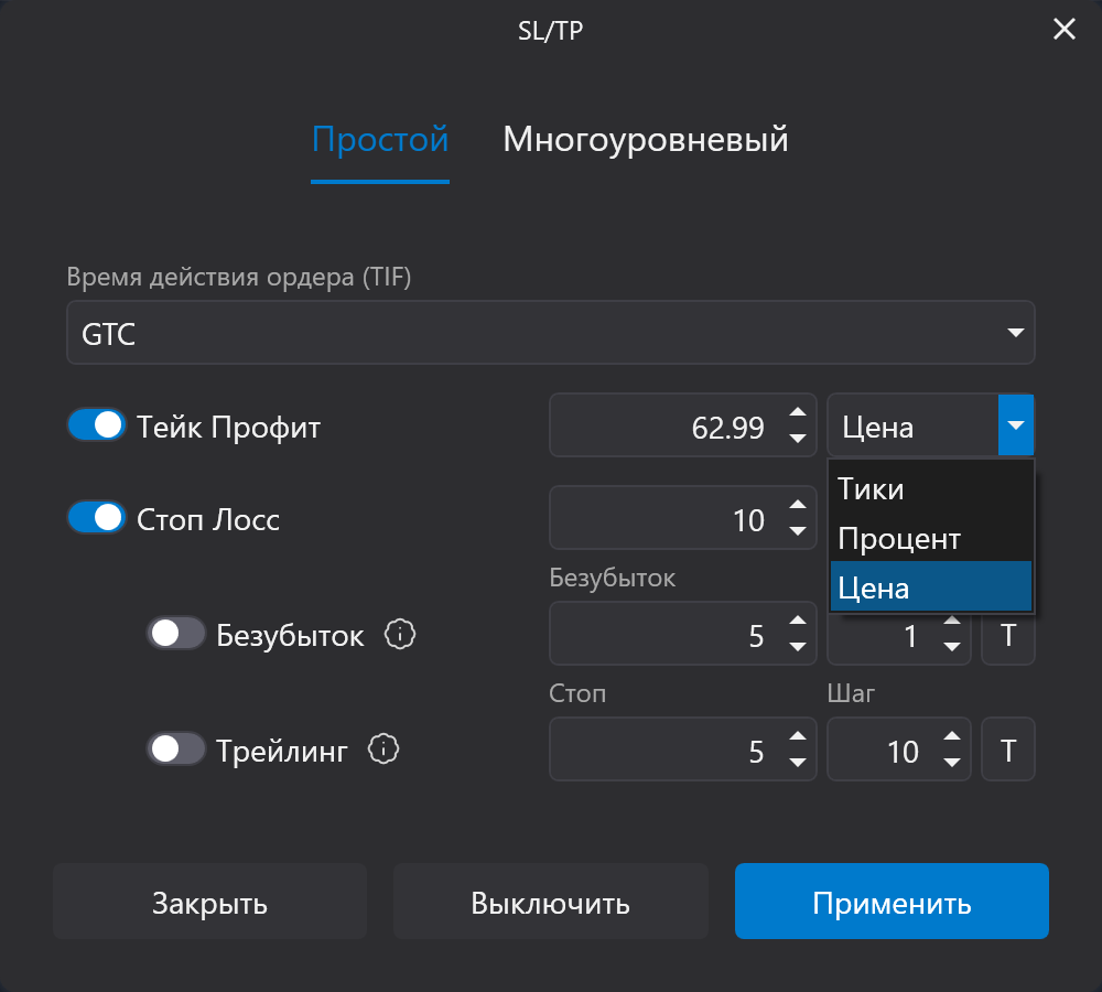 - Простой. ТР и SL можно задавать в тиках, процентах или указать конкретный ценовой уровень. Здесь же можно активировать перевод в безубыток и трейлинг-стоп. Здесь же можно изменять тип ордера (Day, FOK, GTC).