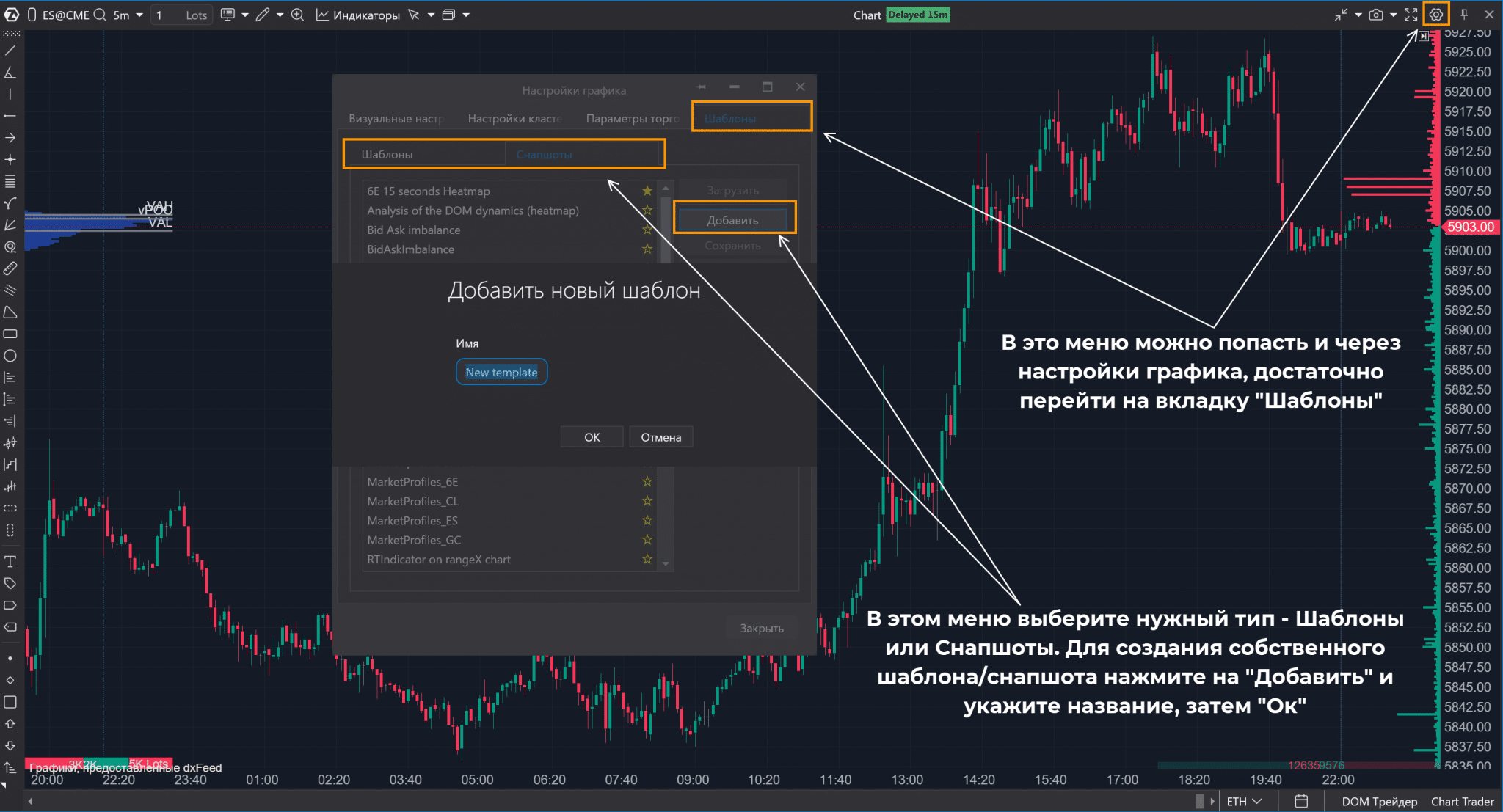 - Шаблоны отвечают за сохранение настроек графика + добавленные индикаторы.