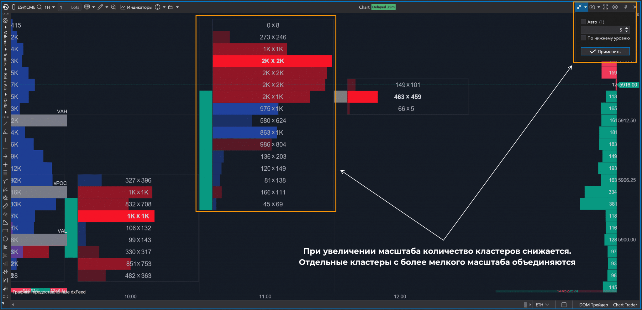 - На уже открытом обычном графике использовать сочетание Shift + k. Автоматически изменится масштаб и появятся кластеры.
