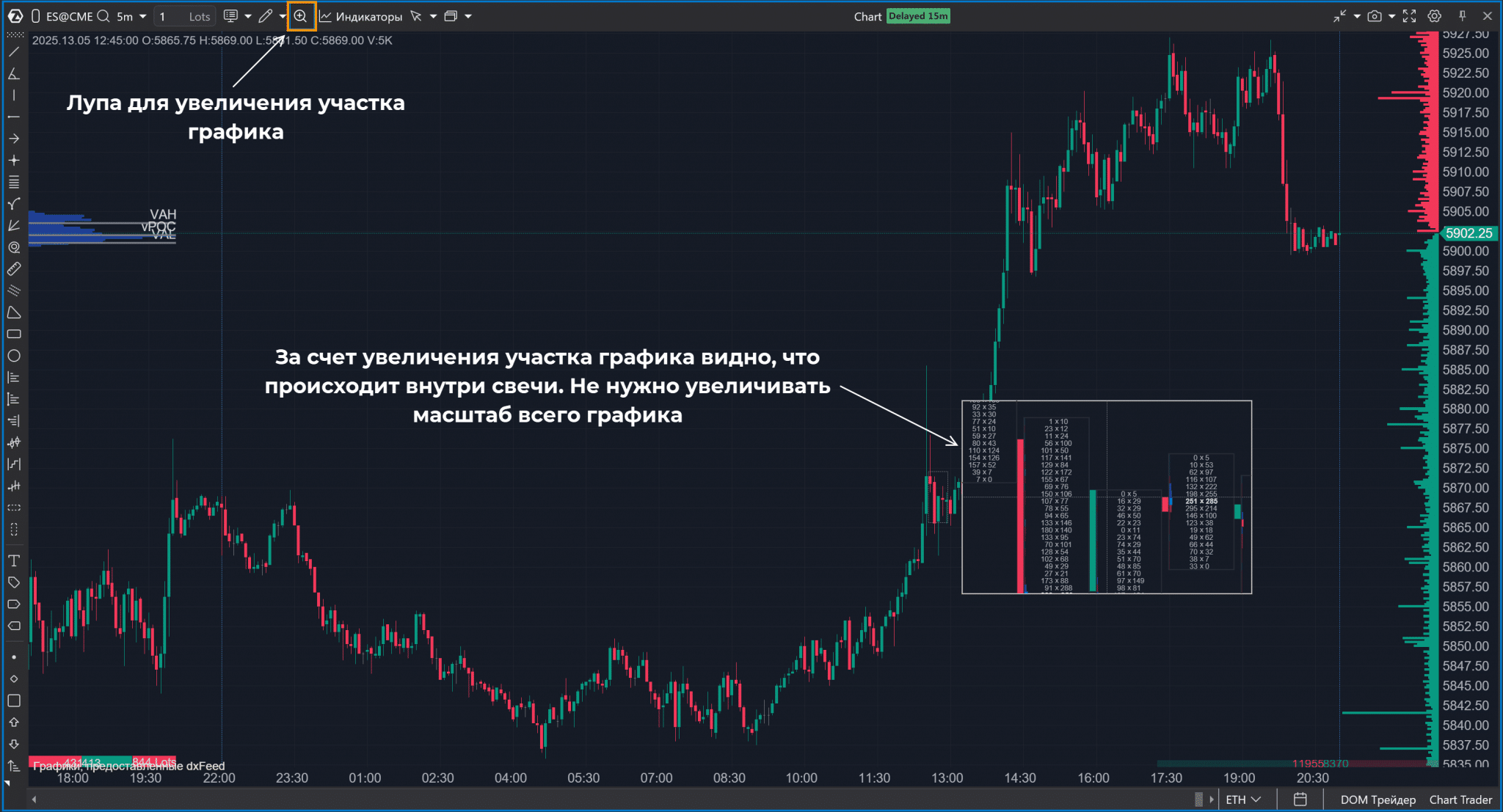 - Рассматривать участок графика «под лупой». Этот инструмент вызывается нажатием кнопки «М», также его можно выбрать на панели инструментов. Если с активной лупой подвести курсор к участку графика, то во всплывающем окне увидите увеличенный участок графика. Это полезно при кластерном анализе, можно посмотреть, что происходит внутри свечи, не меняя масштаб всего графика.