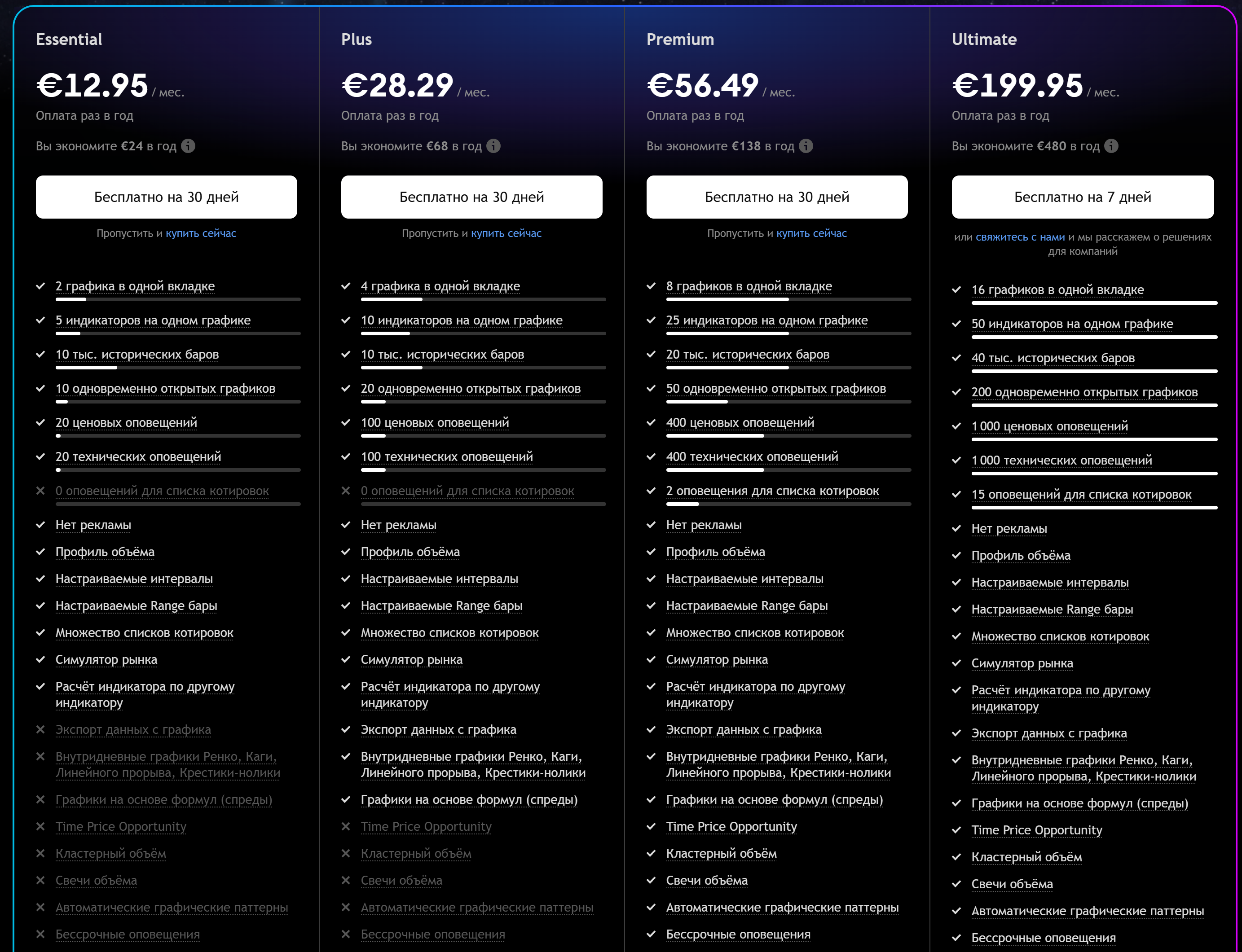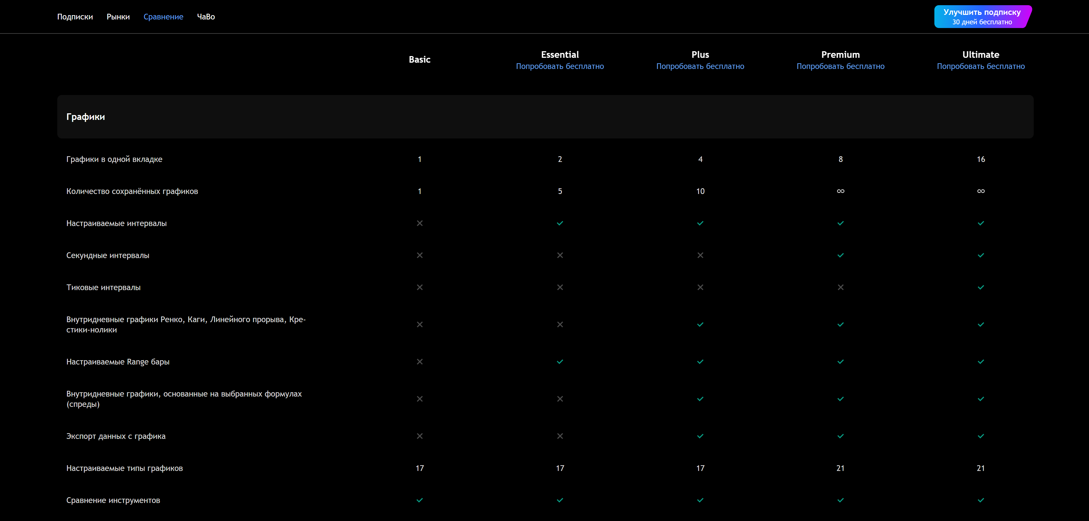 Помимо Basic есть платные тарифные планы Essential, Plus, Premium, Ultimate (в порядке возрастания стоимости). Ниже приведены наиболее значимые различия между Basic и Ultimate, детальные различия между всеми тарифными планами описаны на сайте ТрейдингВью.